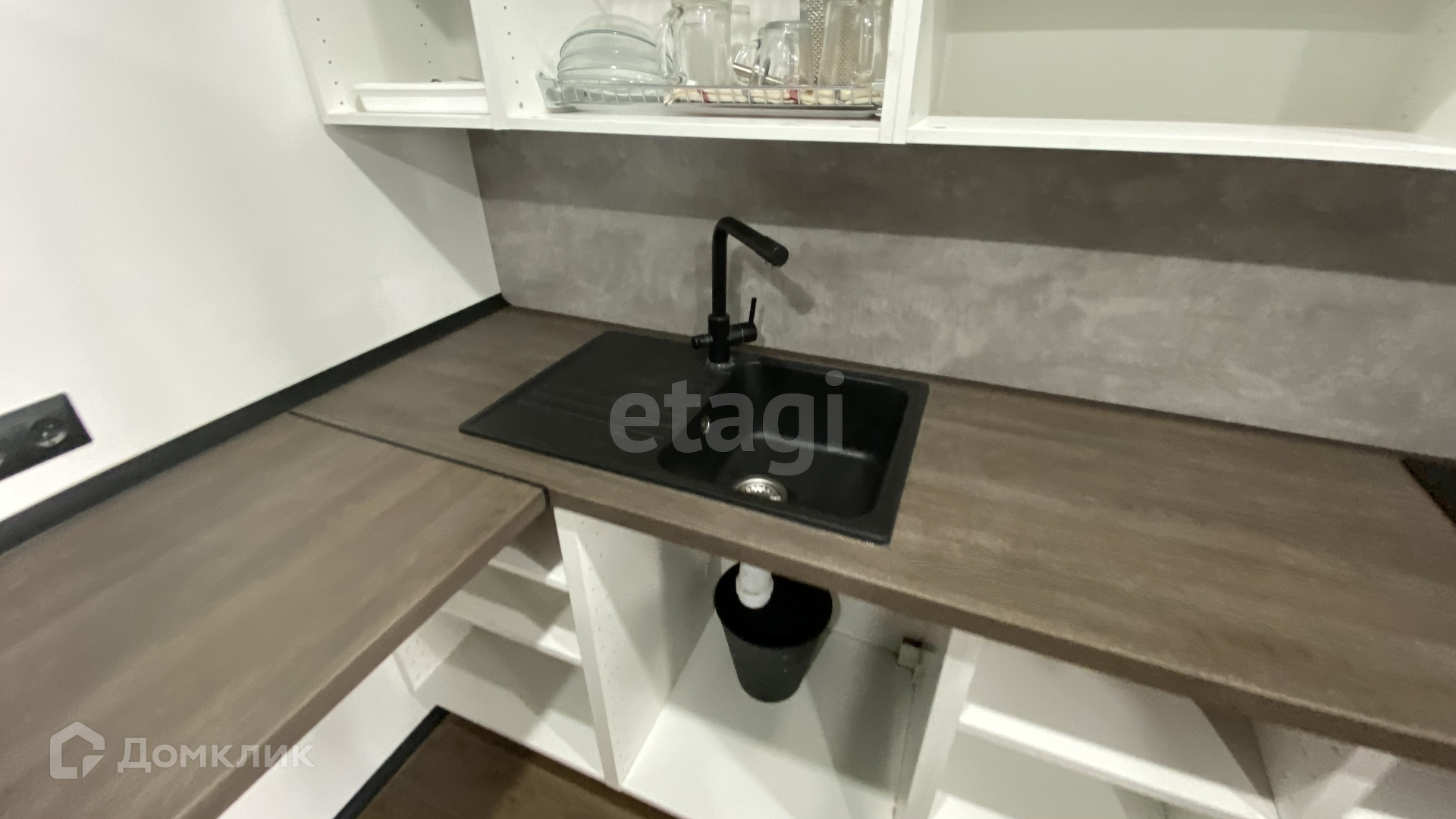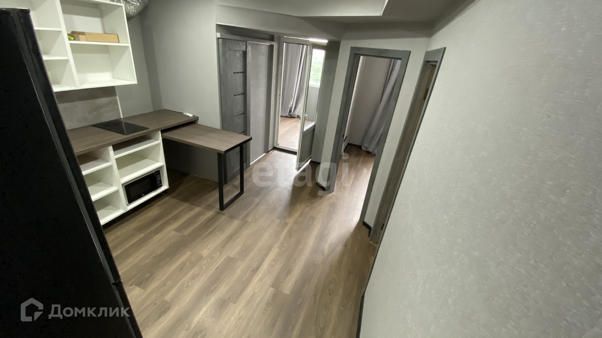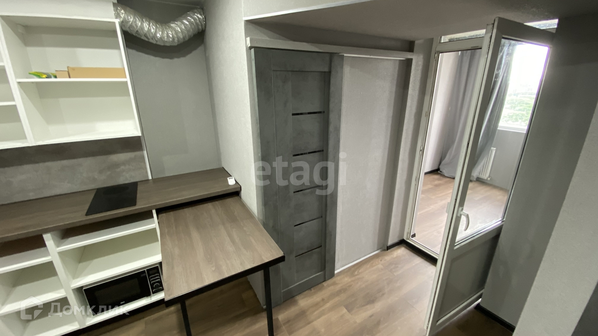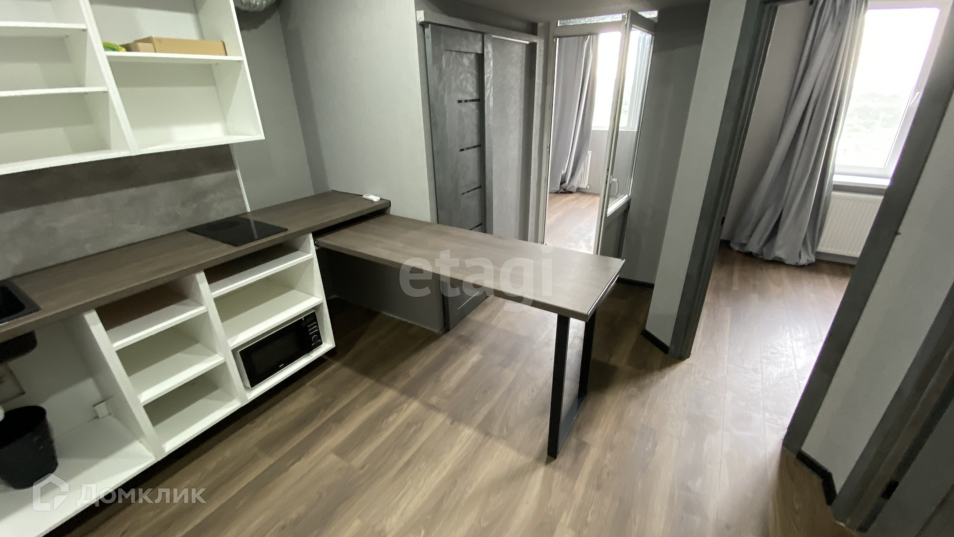 - Кухня. Установлена очень просторная столешница со шкафчиками, раковина, плита, микроволновка, есть много места под духовой шкаф и посудомойку. Выдвижная столешница для бара / еды.