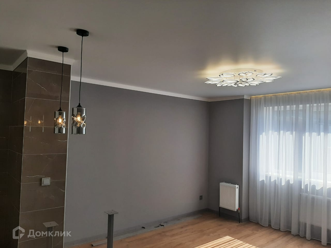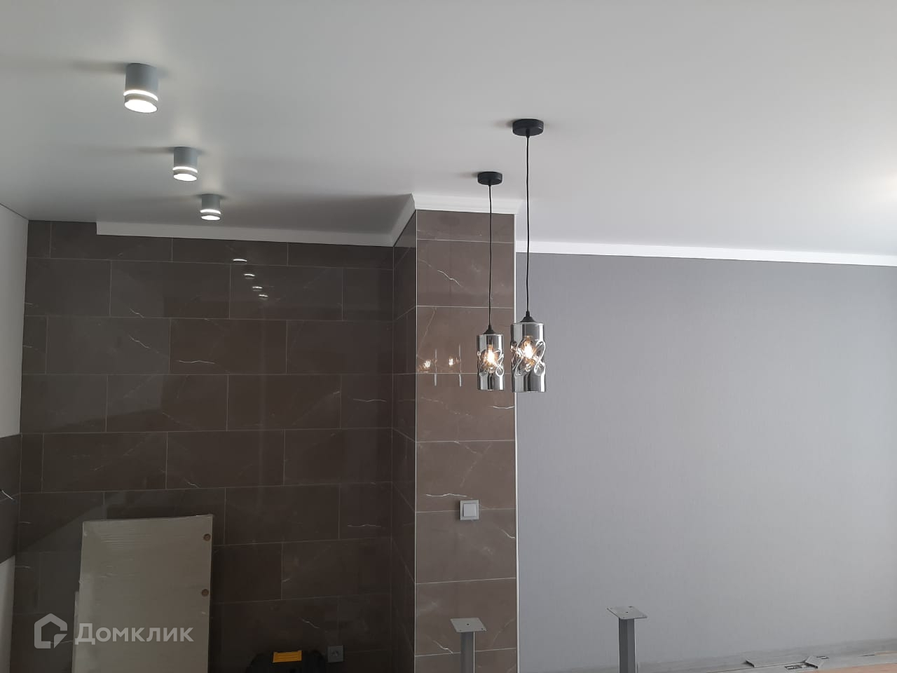 Производится установка кухни с техникой (духовой шкаф, варочная панель, вытяжка, посудомоечная машина с wi-fi модулем), барная стойка с барными стульями, два шкафа купе, подвесные тумбы.