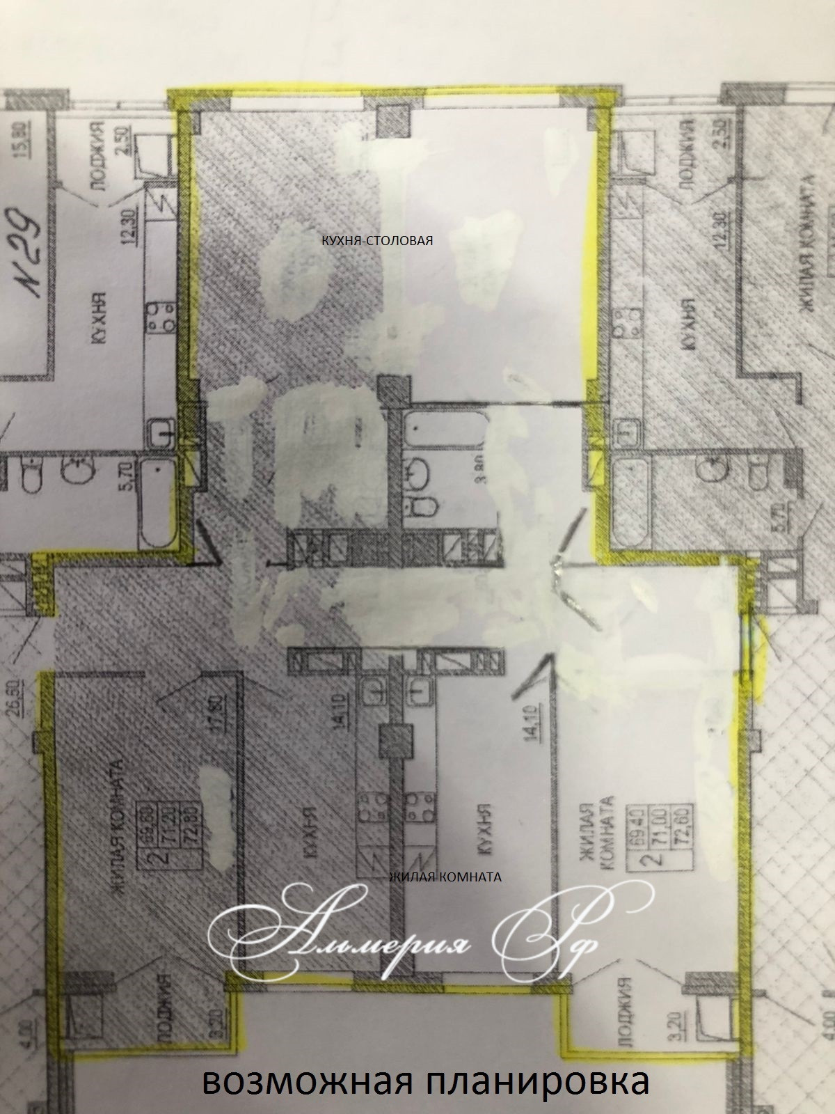 Так же в продаже имеется 2 комнатная квартира площадью 72 кв.м., расположенная на 12 этаже, со всеми указанными выше параметрами, но в соседнем подъезде и зеркальной планировкой (на фото с планировкой 2).