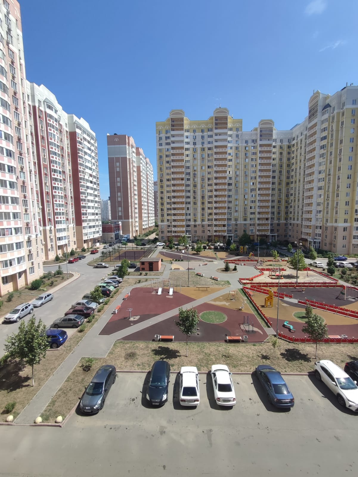 Во дворе детская площадка, рядом школа и садики, остановки и магазины.