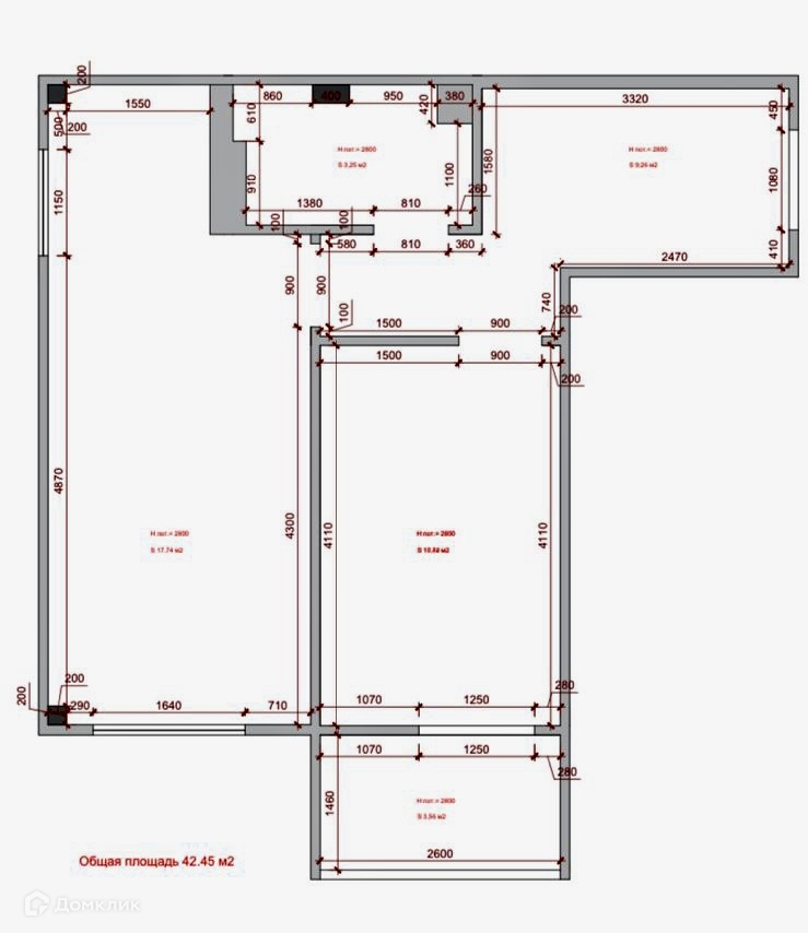 Общая площадь 42.5 м2