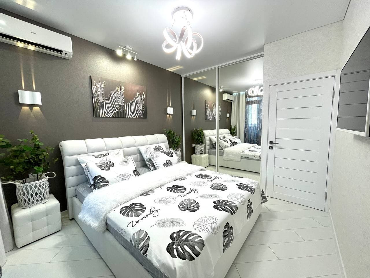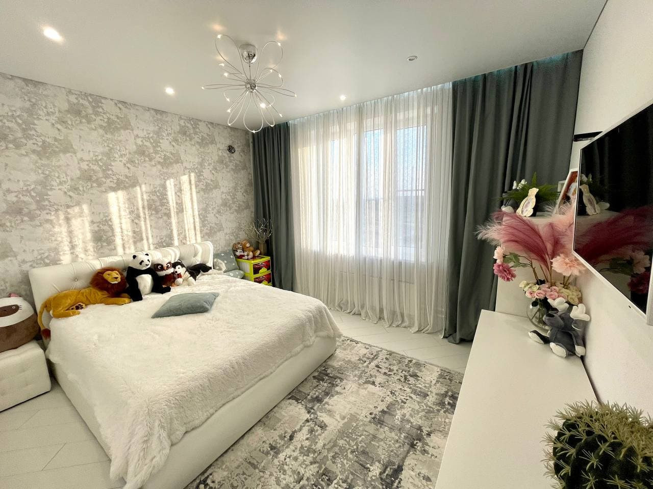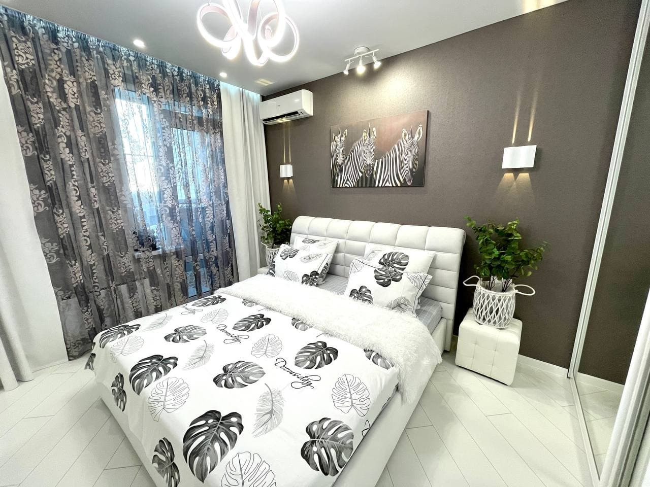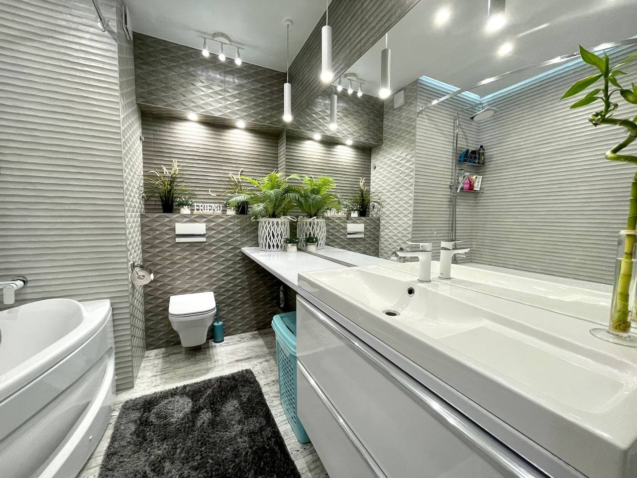 В квартире выполнен новый дизайнерский ремонт. Все отделочные материалы класса А. Эксклюзивная плитка в санузле, тумбы и мебель на заказ. Шикарная гардеробная система - большое количество шкафов во всей квартиры очень удачно спрятанные в нишах комнат, визуально расширяя пространство благодаря большому количеству зеркал.