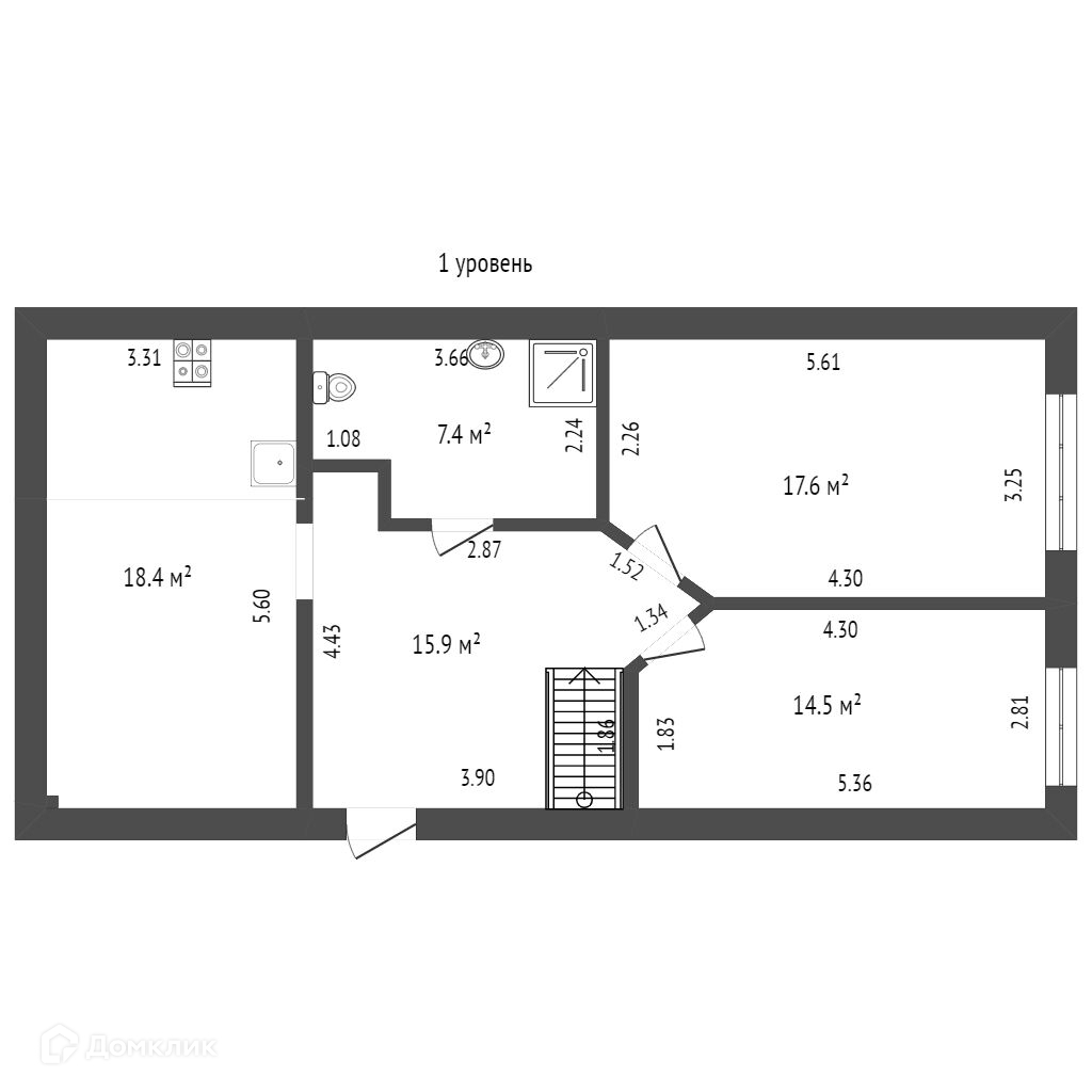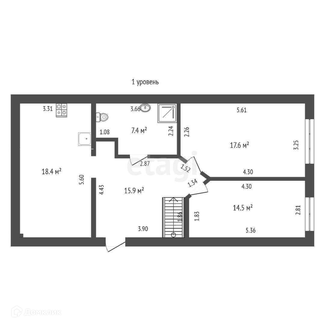 1 этажа состоит из хола, кухни студии, сан узла и 2 комнаты.