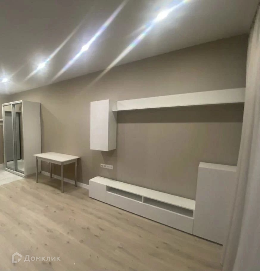 В квартире выполнен свежий ремонт в теплых тонах. В кухонной зоне установлен гарнитур со встроенной техникой. В жилой зоне установлен мягкий диван, стойка под телевизор и обеденный стол. В прихожей установлен шкаф — купе. Установлена сплит — система.