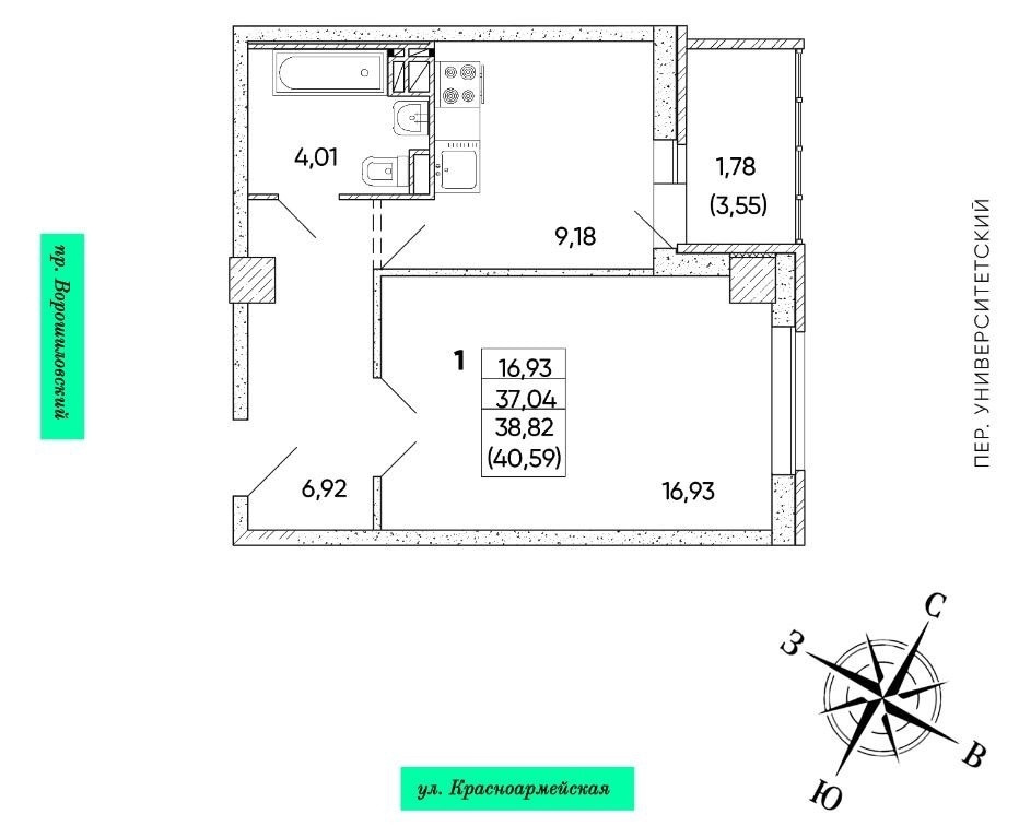 1-комнатная квартира, 40.59 м2, этаж 12 / 25, на продажу в Ростове-на-Дону, Университетский переулок, 137