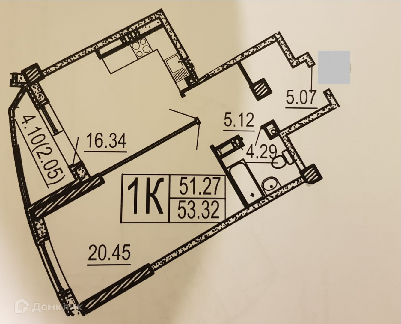 Общая площадь 51,27 кв. м., жилая площадь 20,45 кв. м., площадь кухни  16,34 кв. м., площадь балкона  4,1 кв. м,