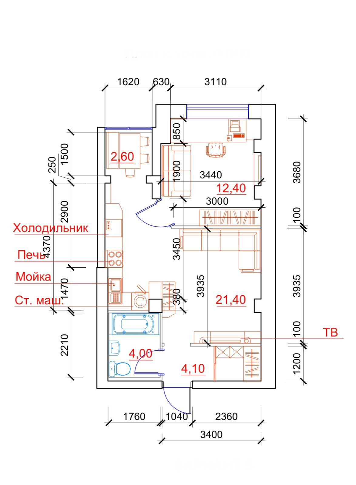 Общая площадь 42 м2