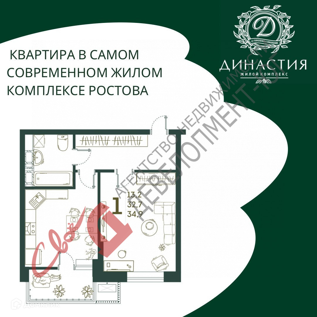 Полноценная 1 к квартира общей площадью 36 кв самом современном и инновационном комплексе Ростова-на-Дону ЖК Династия.
