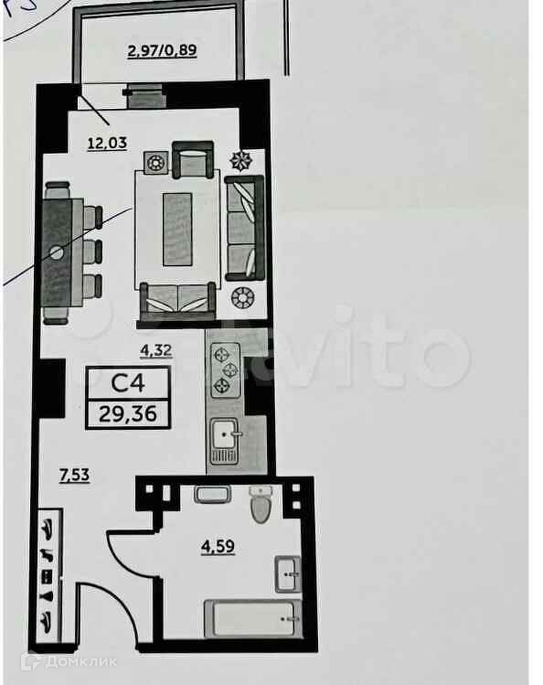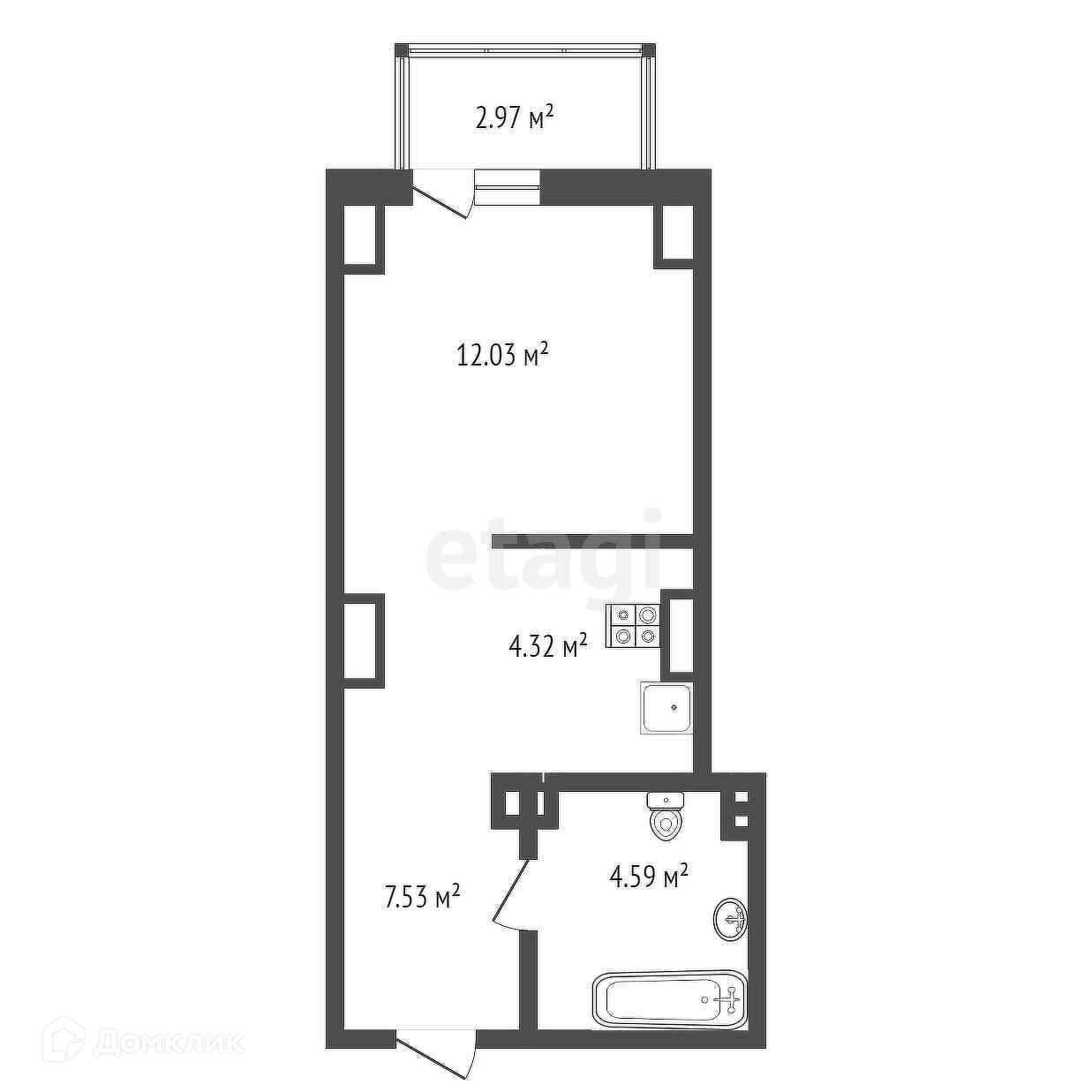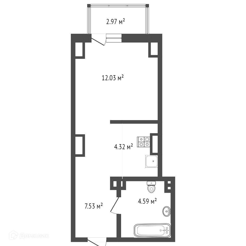 Удачная планировка как для небольшой 28-ми метровой студии. Свой большой балкон, жилая зона отделена угловым коридором.
