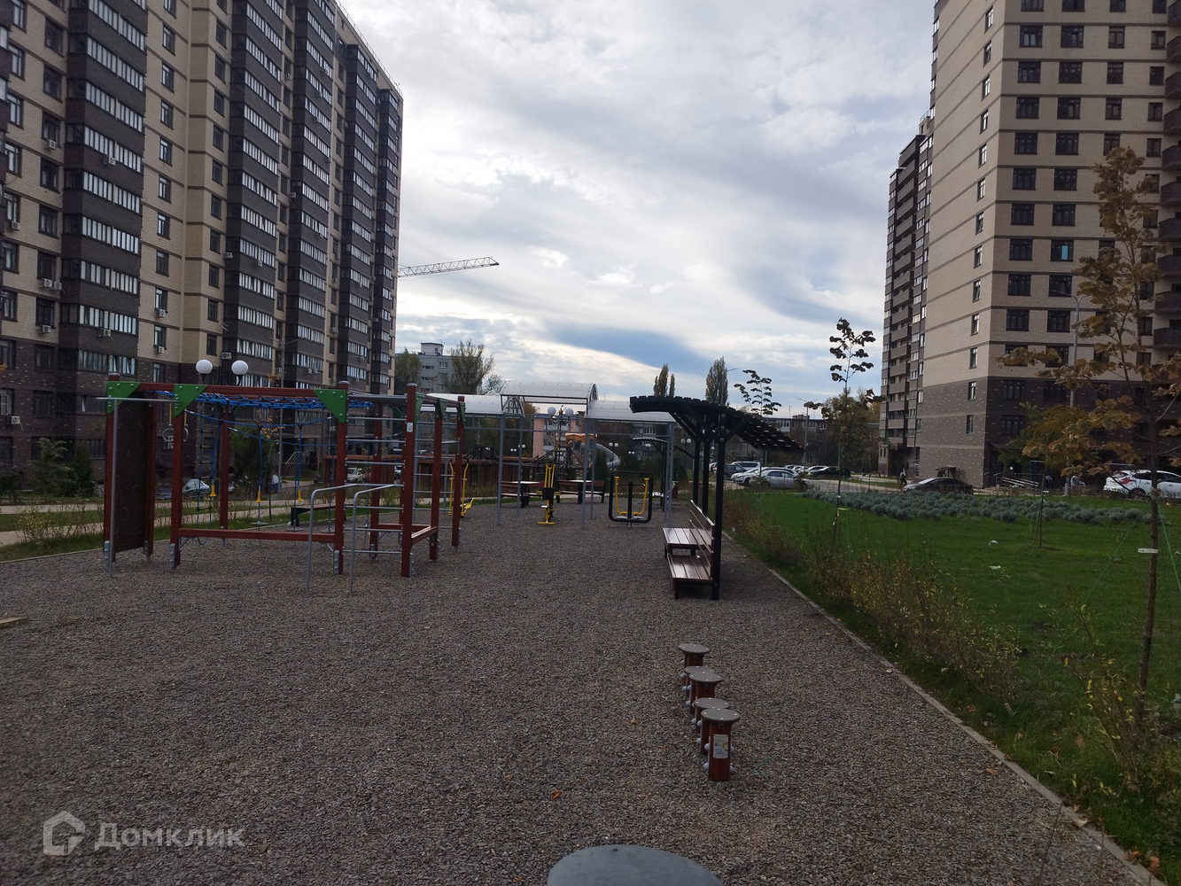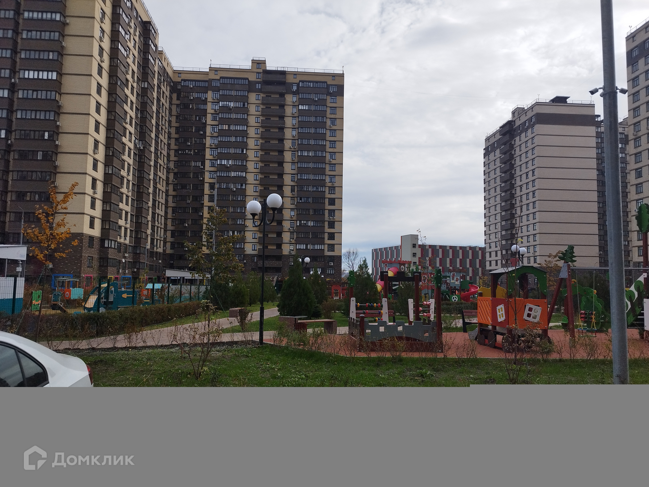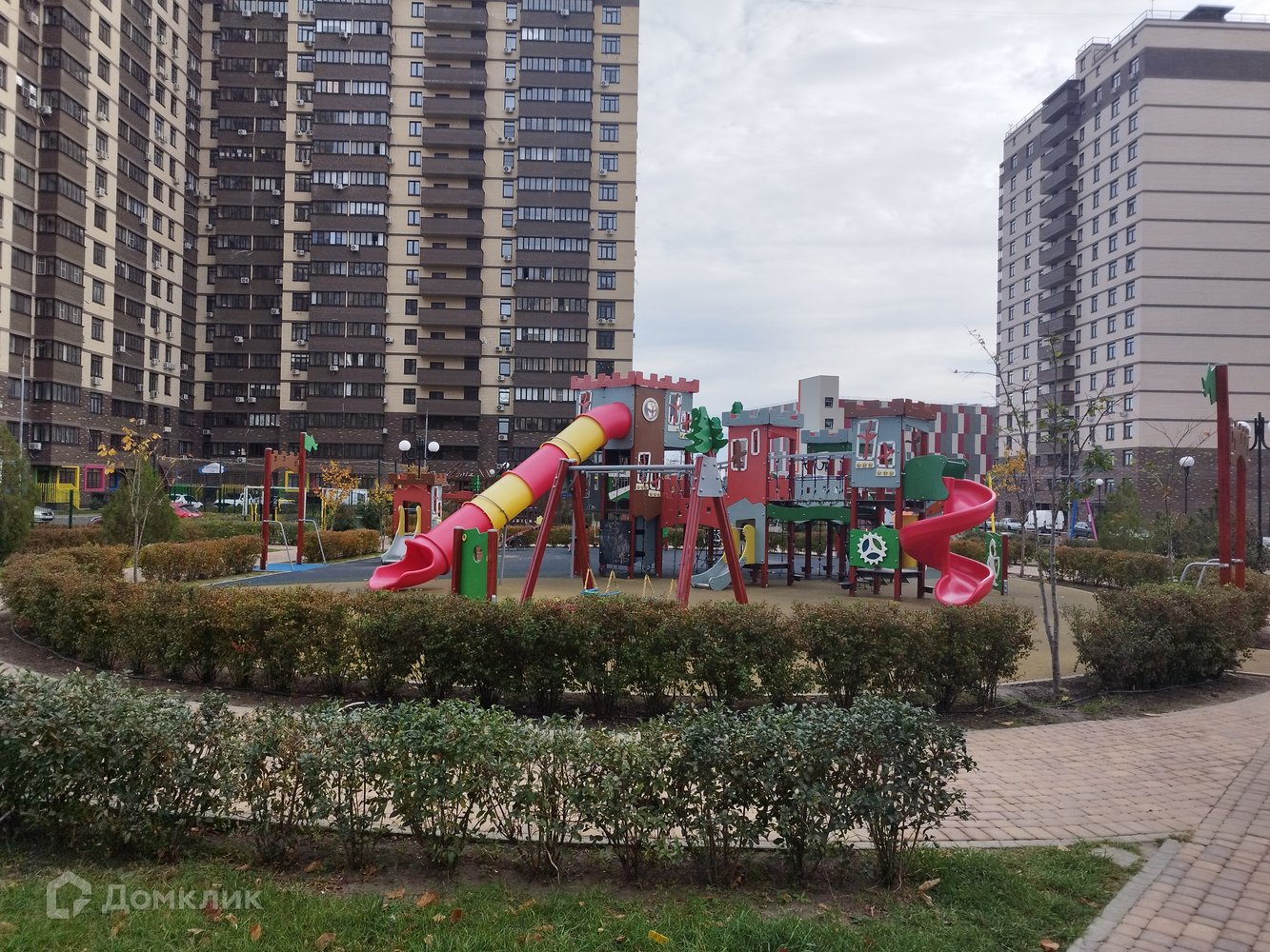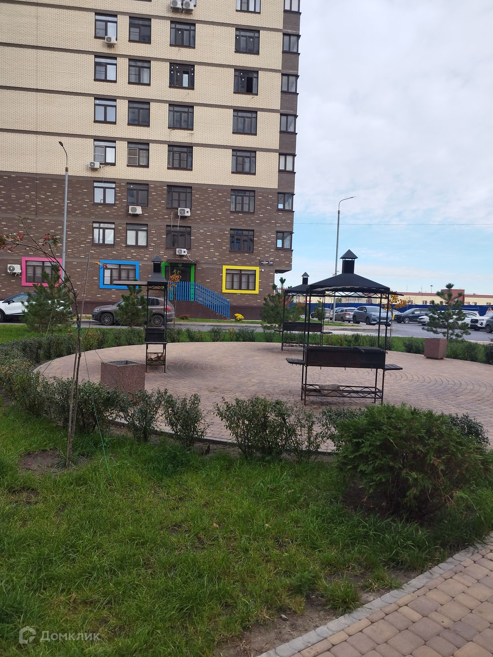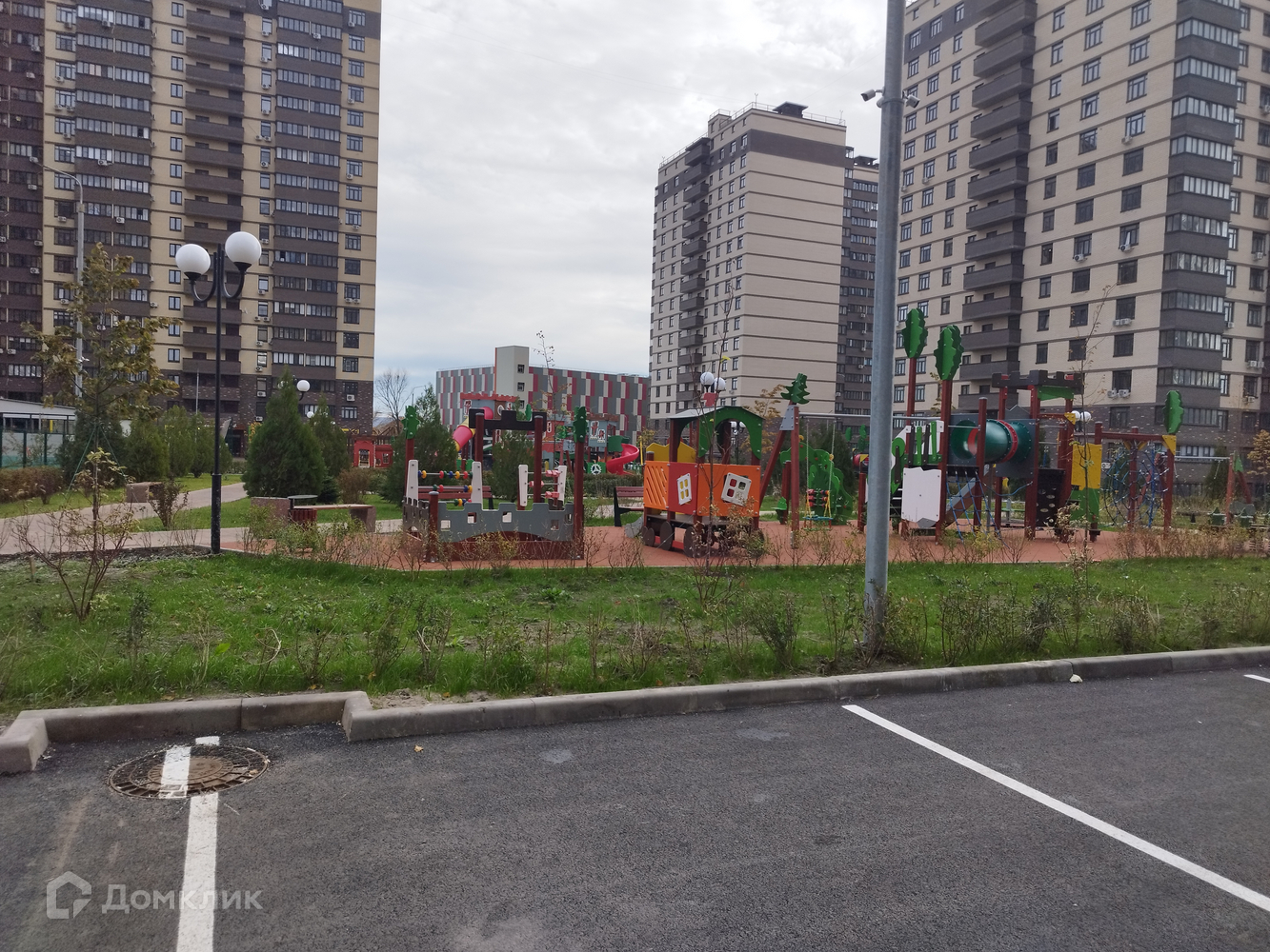 Комплекс с закрытой и охраняемой территорией. Ворота управляются через мобильное приложение. Большая прогулочная зона с множеством детских городков. Есть свое футбольное поле, баскетбольная и волейбольная площадки, зона с тренажерами. Так же есть выделенная зона с тремя мангалами.