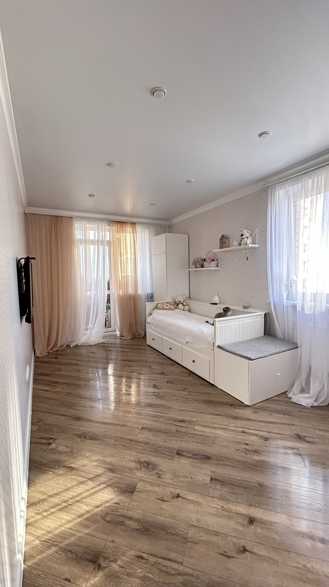 Три зacтекленных балконa (в кaждой кoмнaте) из спaльни и кухни французское окно. Три кондиционера.