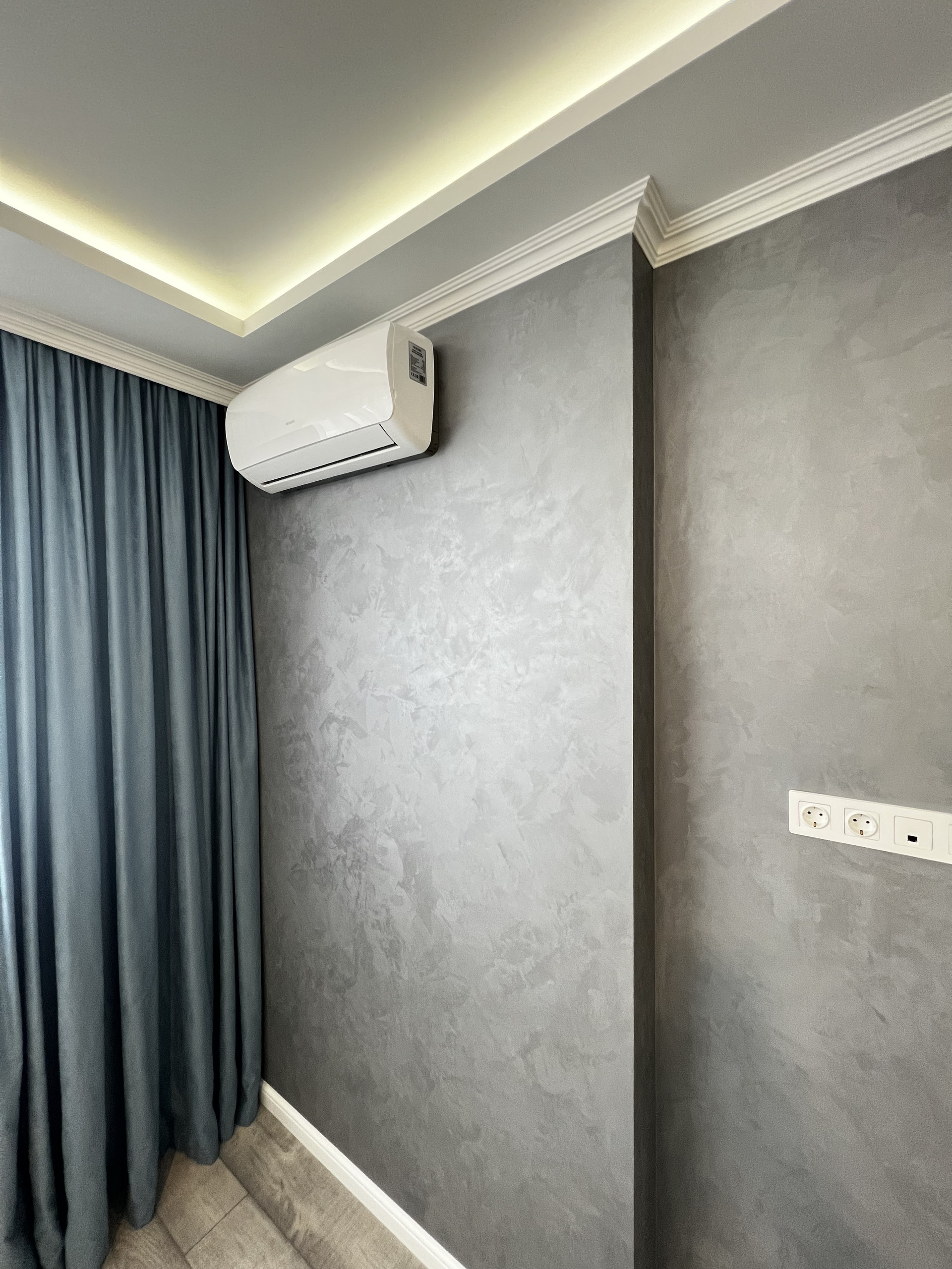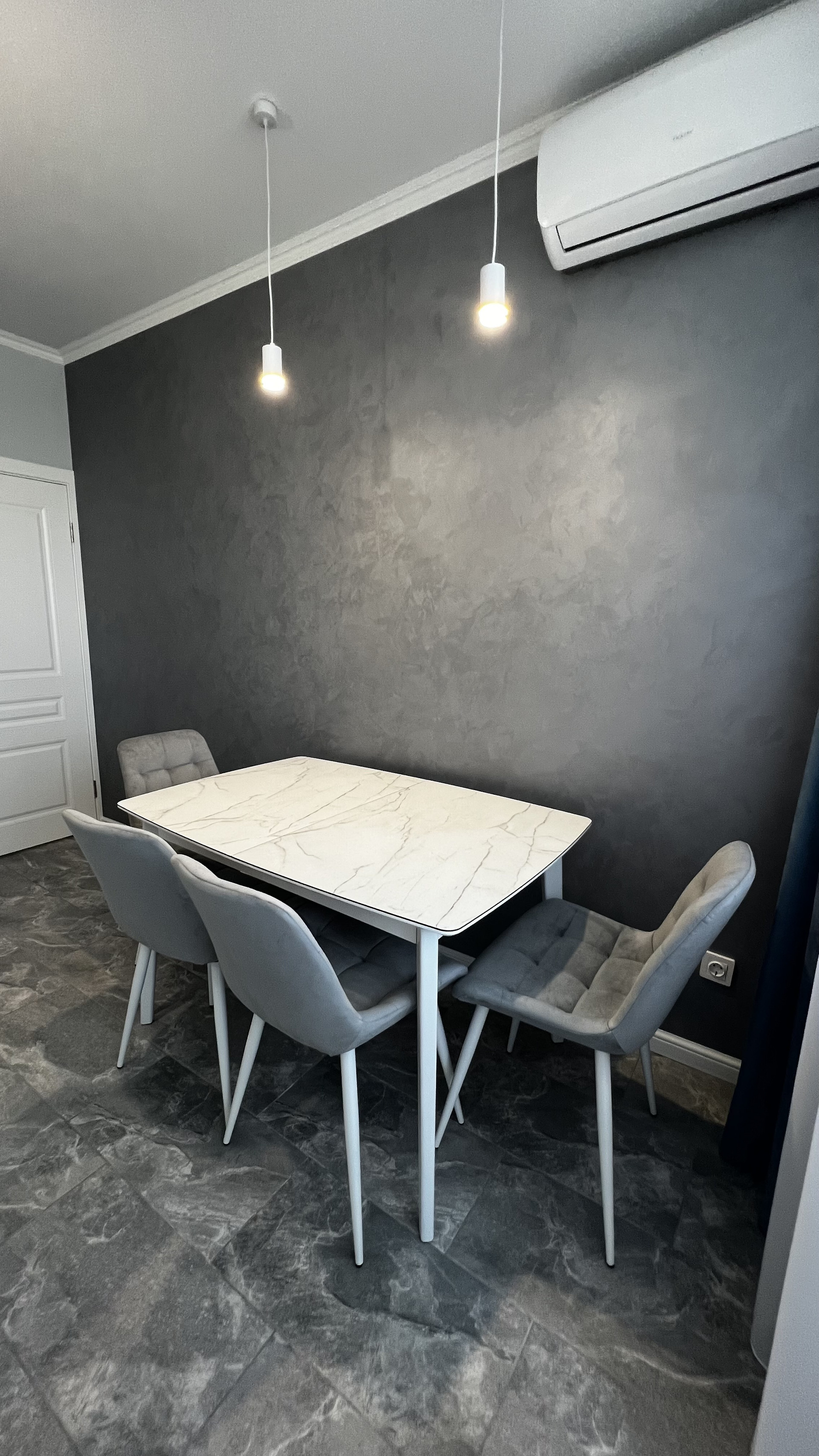 В квартире сделан дизайнерский ремонт , на стенах декоративная штукатурка, итальянская плитка.