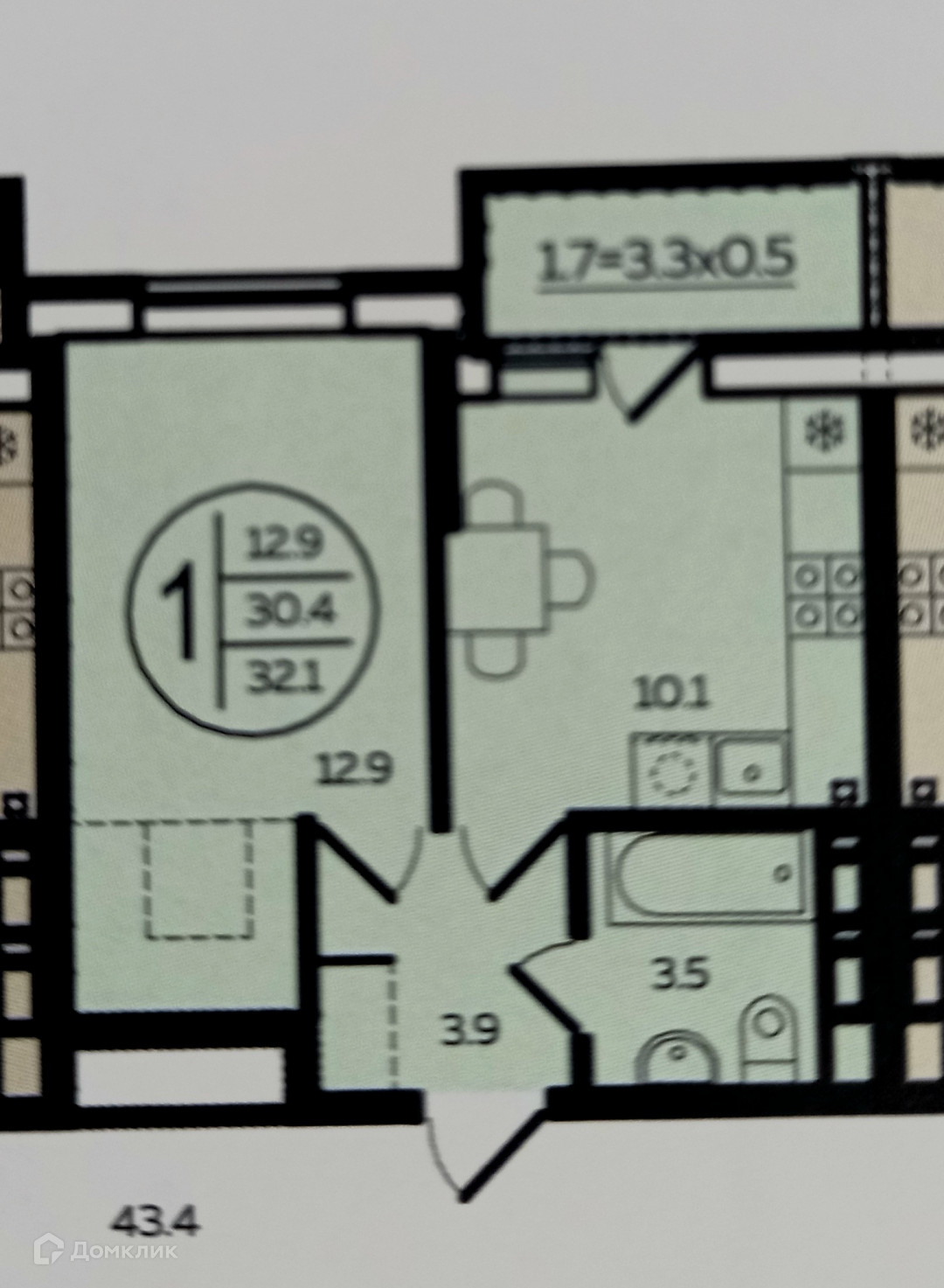 Общaя площадь квартиры 32.7 кв.м, плoщадь комнаты 12.9 кв.м. Куxня - 10 кв.м.