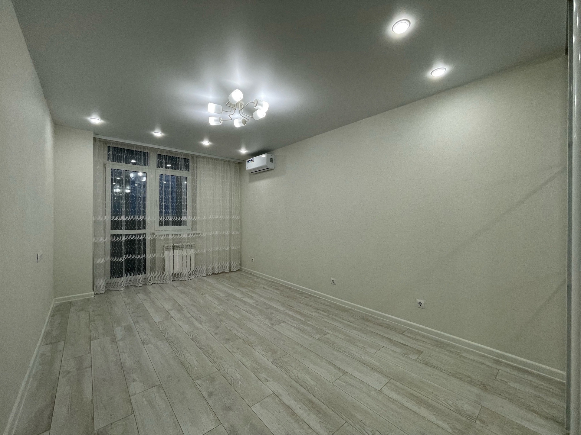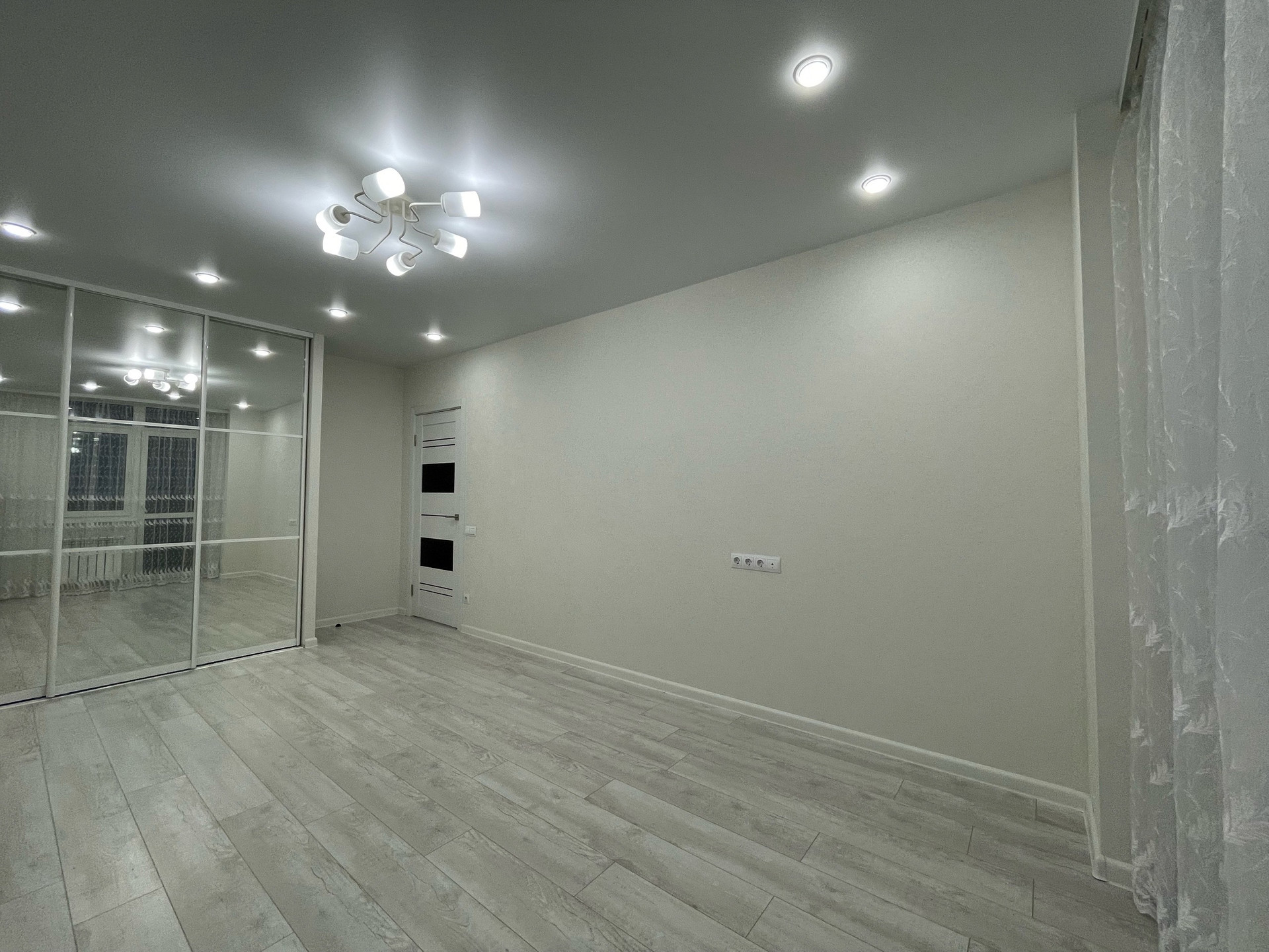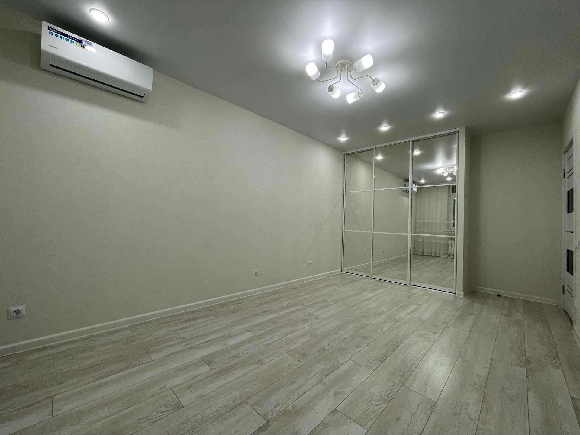 Изолированная спальня, установлен второй кондиционер. Повесили шторы ,установили большой встроенный шкаф-купе с наполнением! Много освещения,качественный ламинат 33 кл,натяжные потолки!