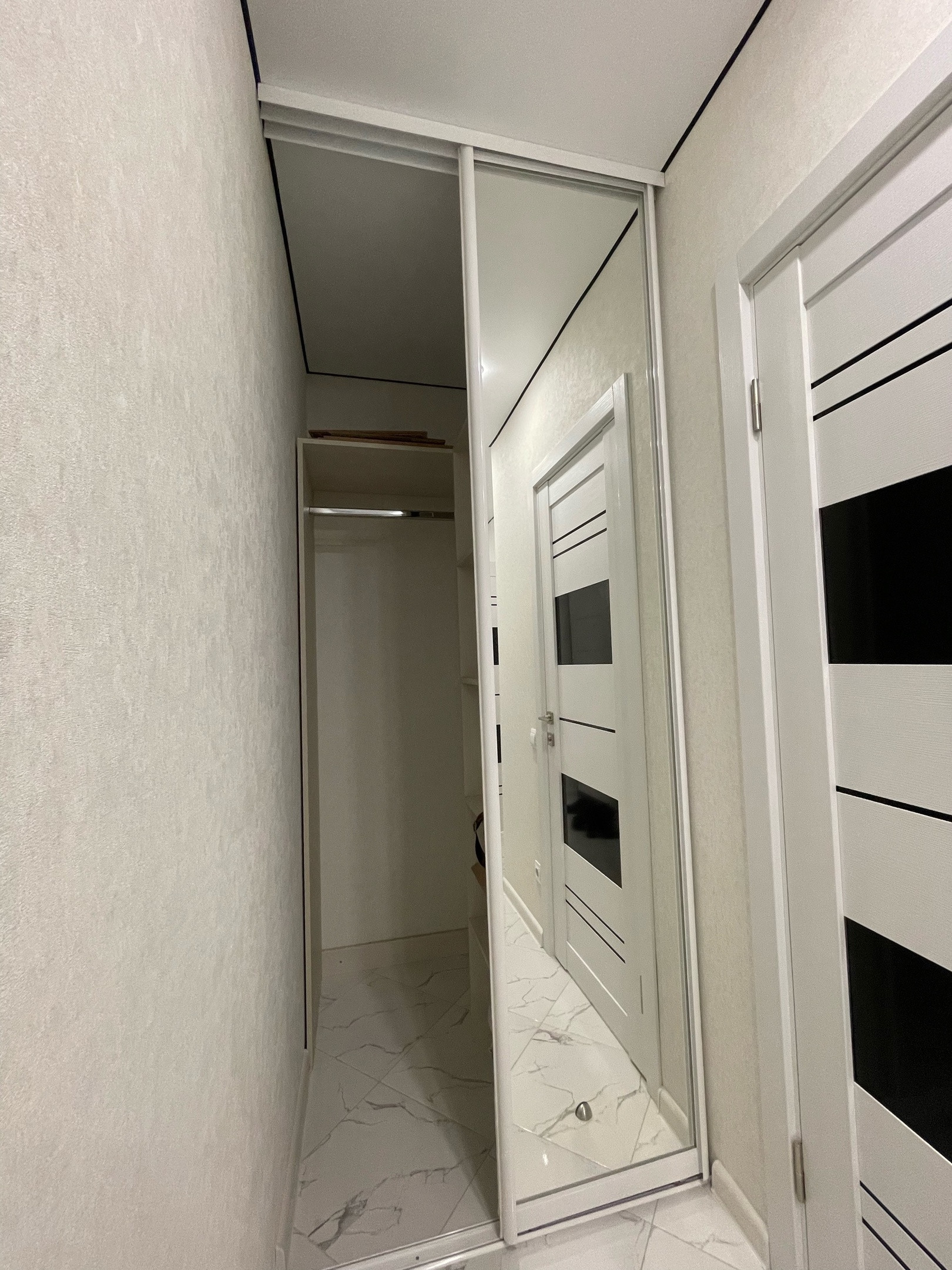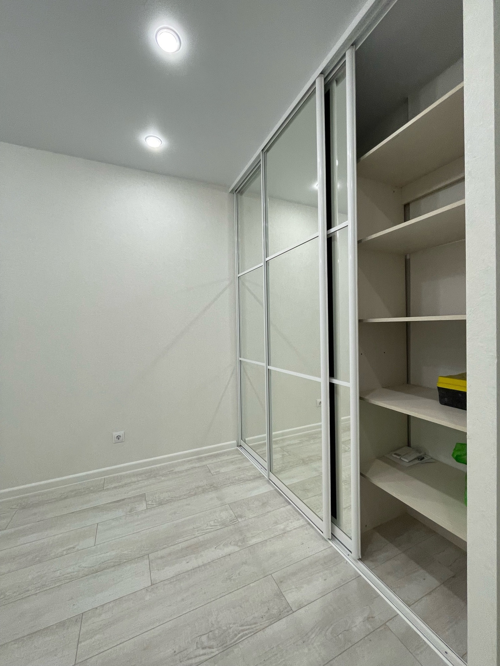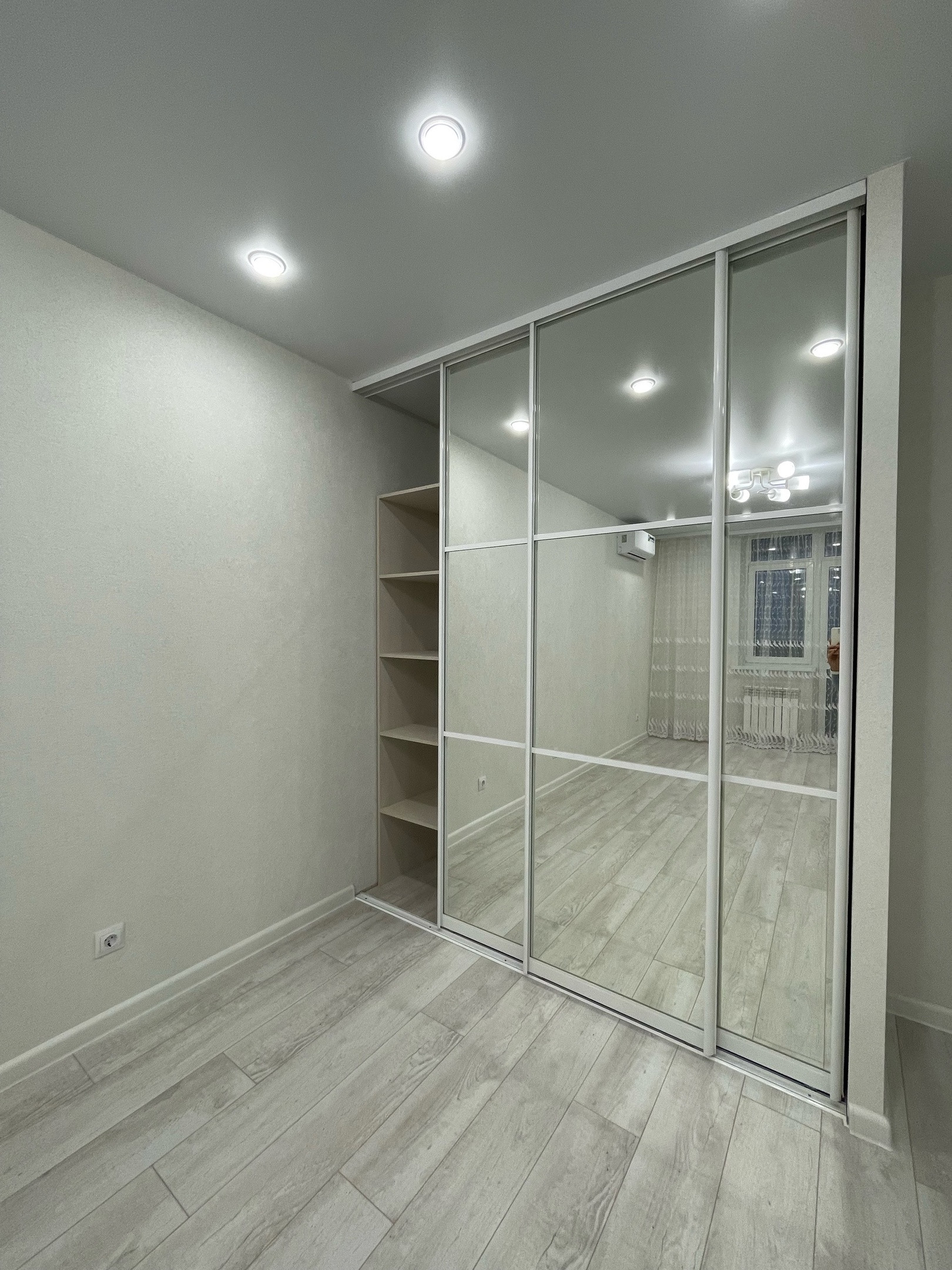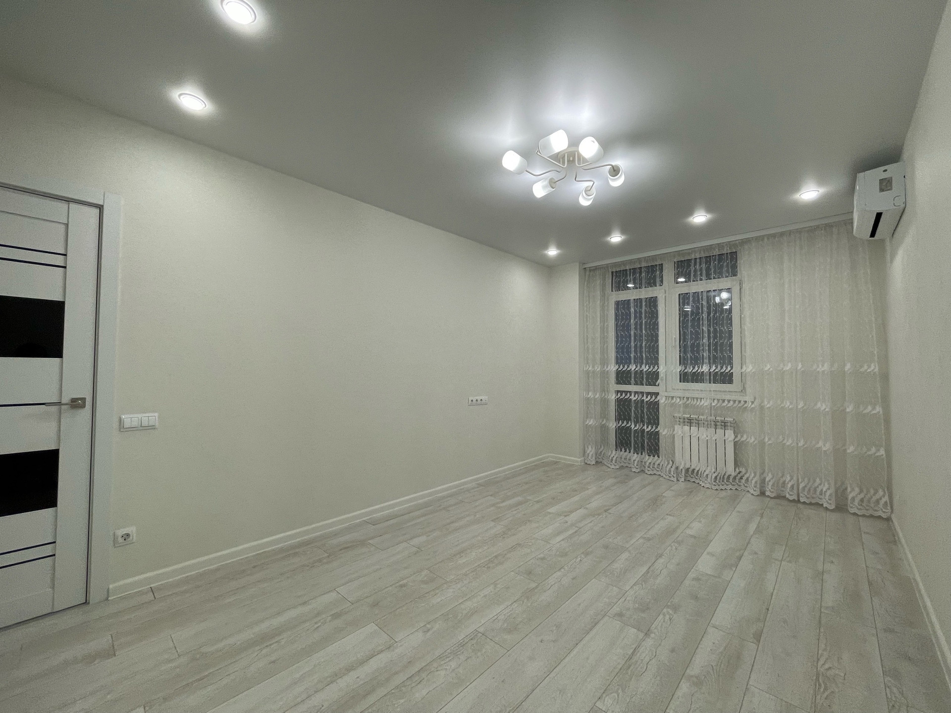 Изолированная спальня, установлен второй кондиционер. Повесили шторы ,установили большой встроенный шкаф-купе с наполнением! Много освещения,качественный ламинат 33 кл,натяжные потолки!