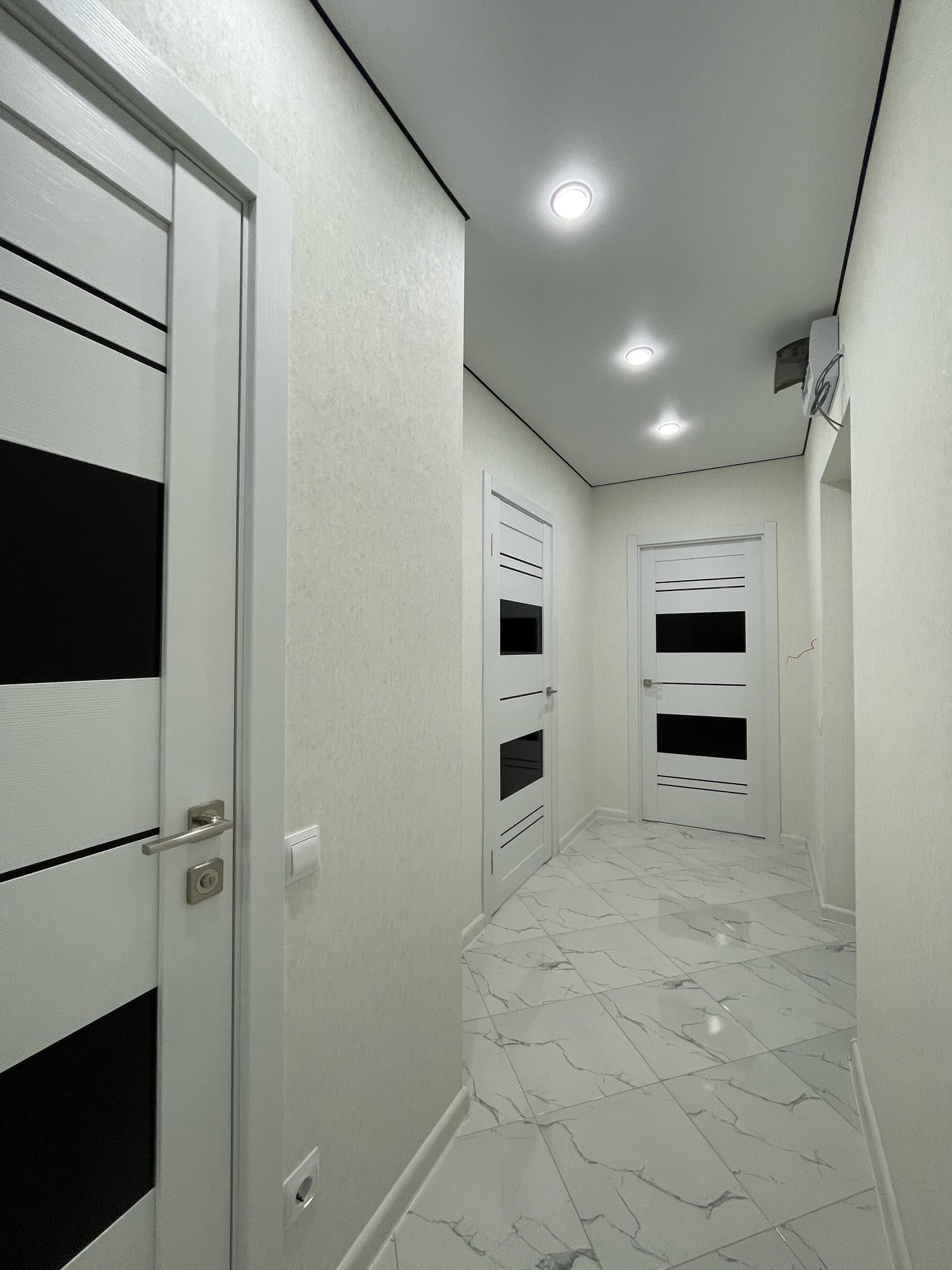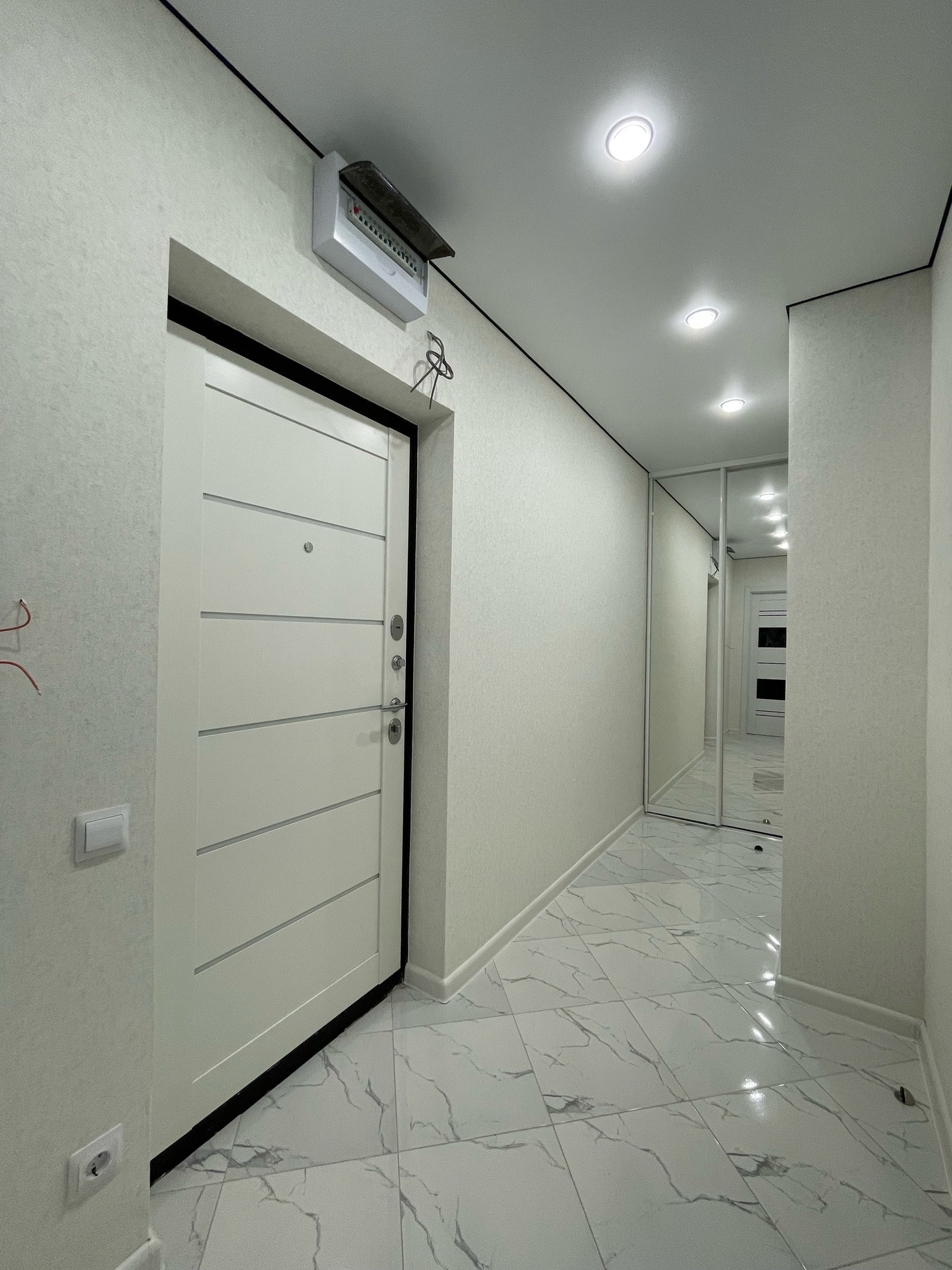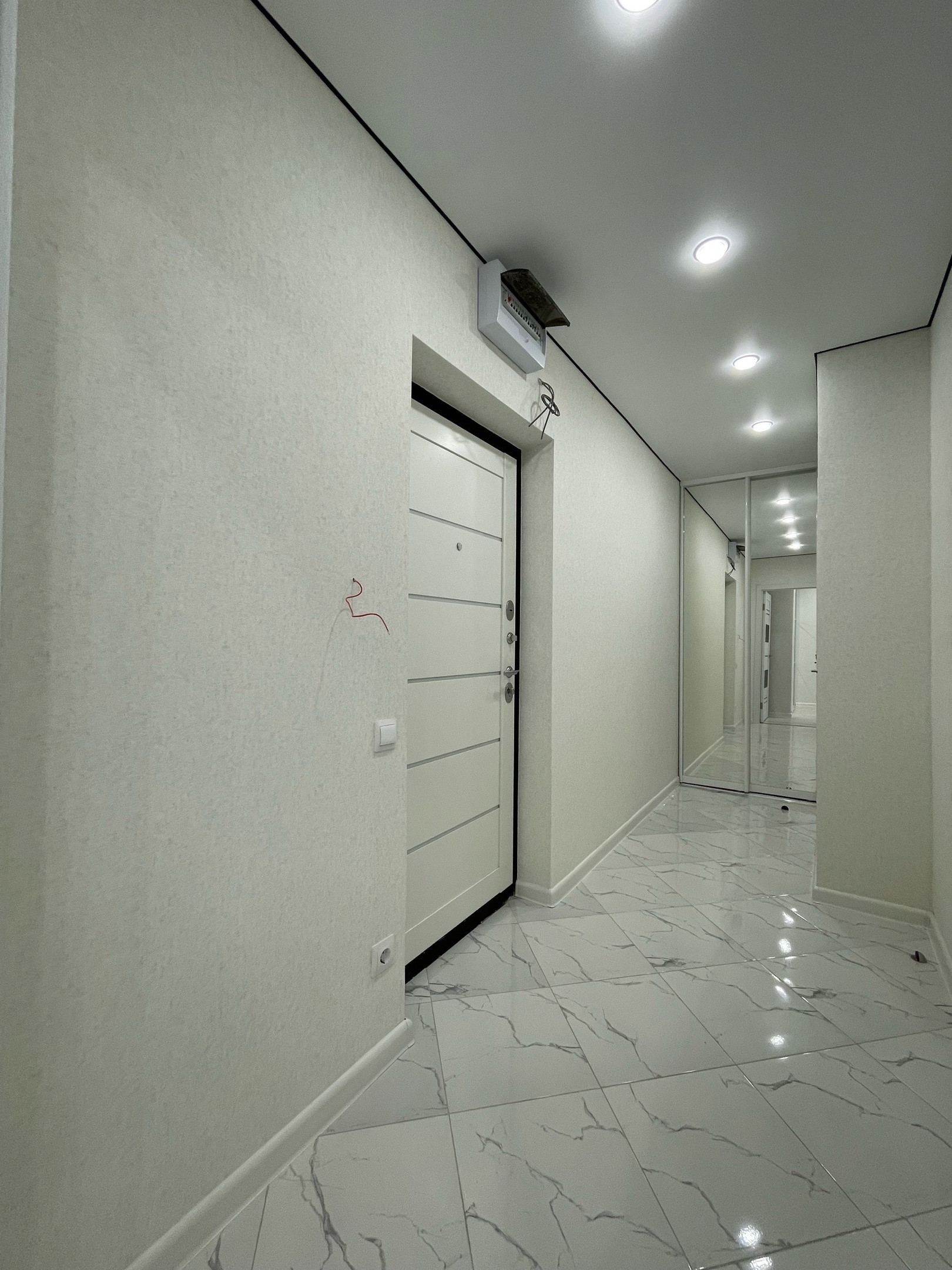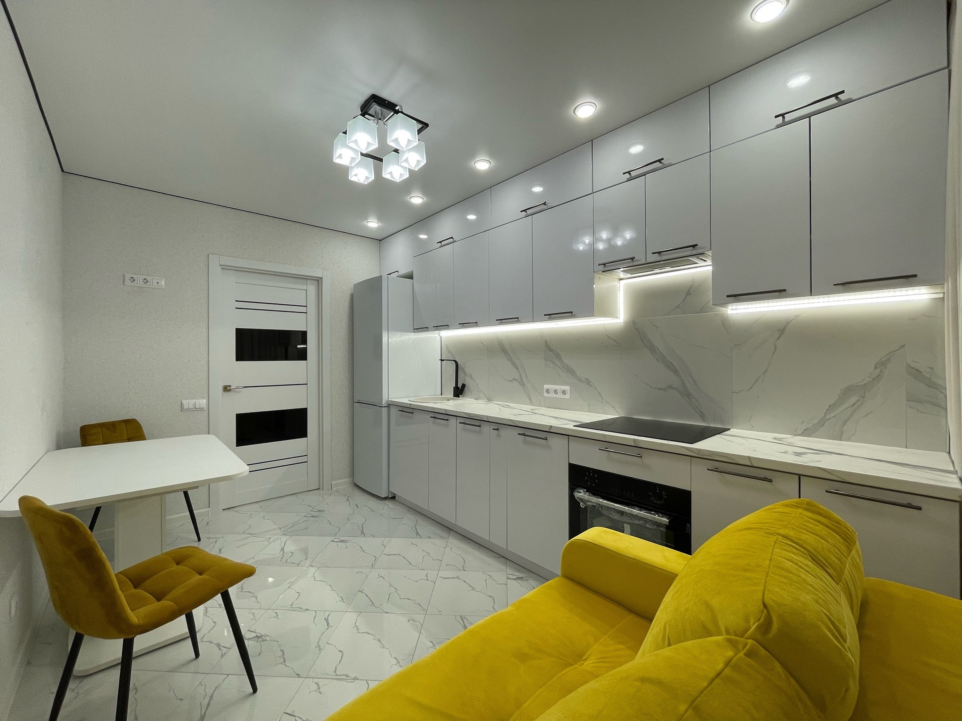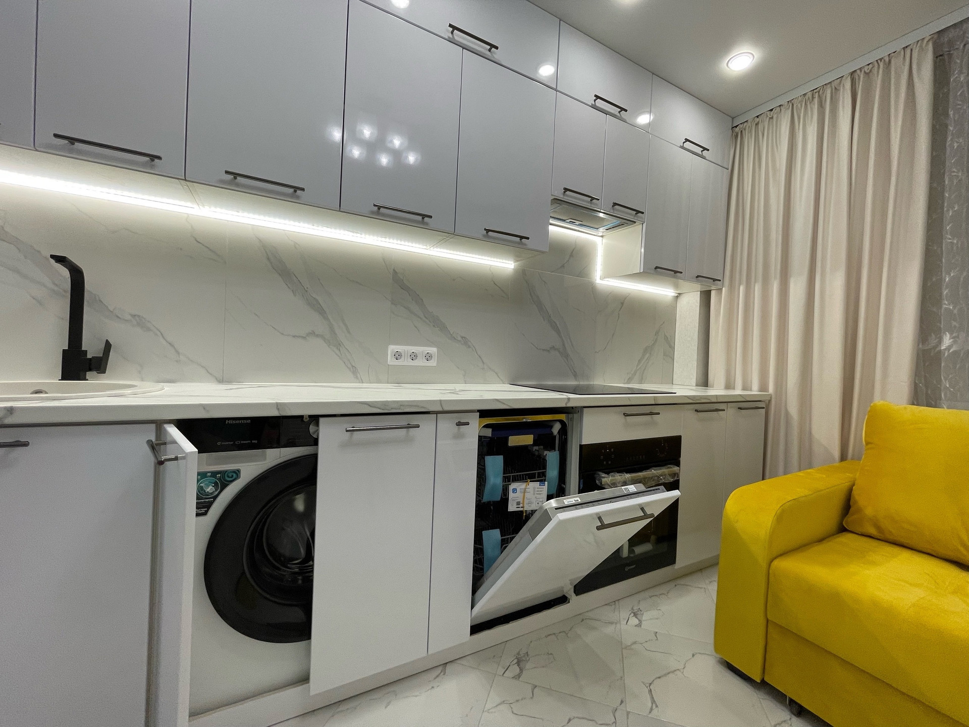 Функциональная,качественная разводка электрики, продумано что где будет стоять и включаться. Кухня сделана на заказ , встроенный духовой шкаф, достаточное количество шкафов, розеток на рабочей зоне, вытяжка, установлена посудомойка и стиральная машина!Холодильник лаконично встроен,вся техника премиального качества!