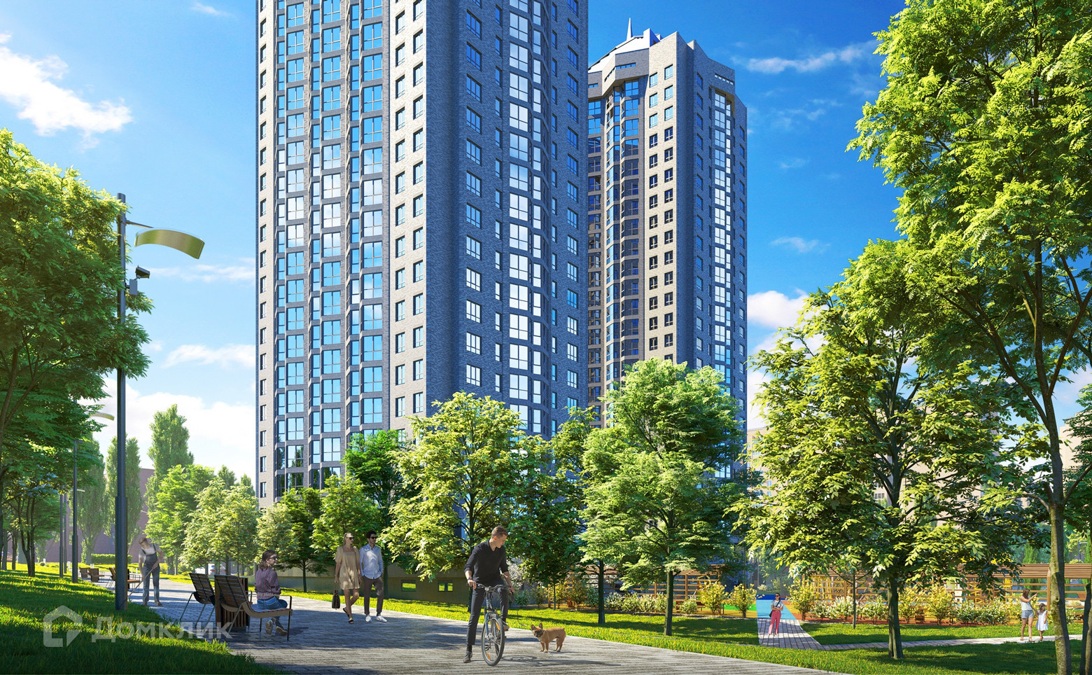 Во дворе разбит двор-парк, проложена сеть аллей, спроектирован фонтан, организована яркая спортивная и игровая инфраструктура.