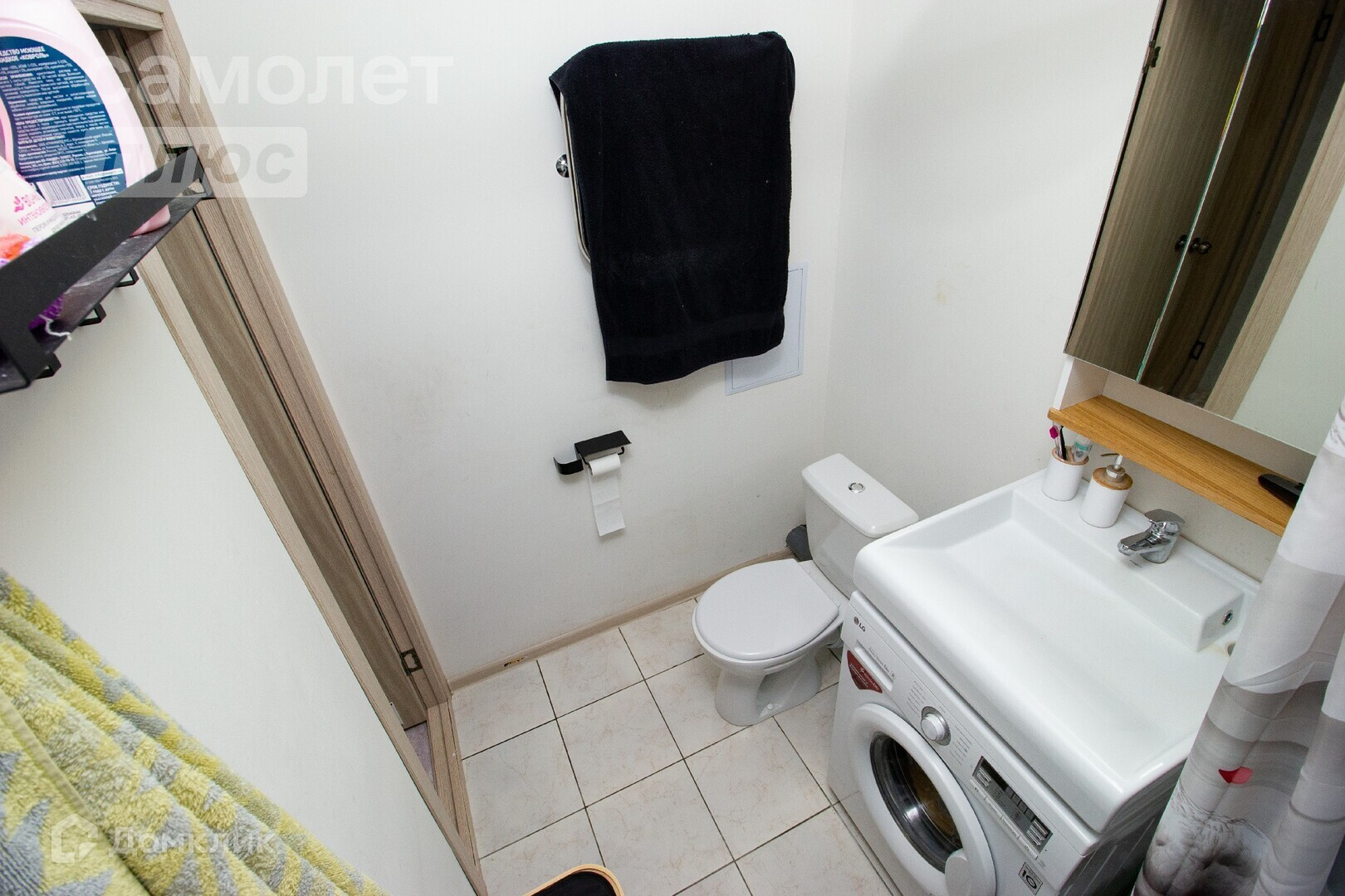 Санузел совместный: хорошая, качественная плитка. Установлена ванна; раковина с подвесным шкафом с зеркалами; стиральная машина; туалет; полотенцесушитель.