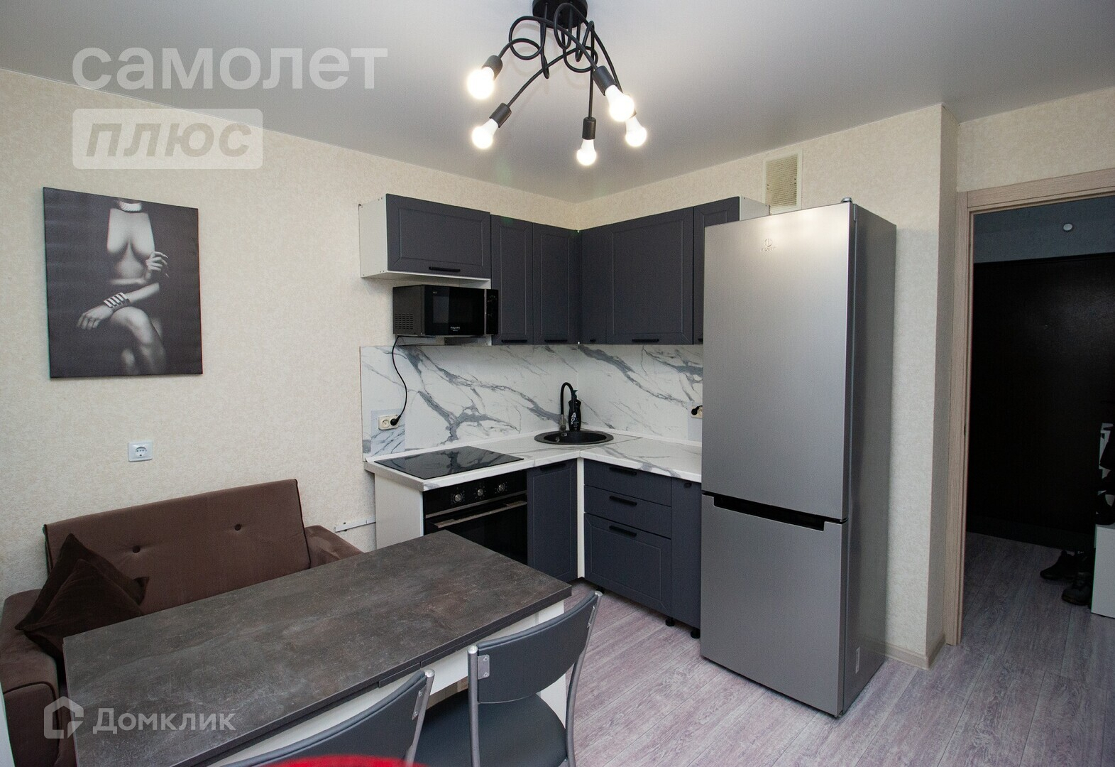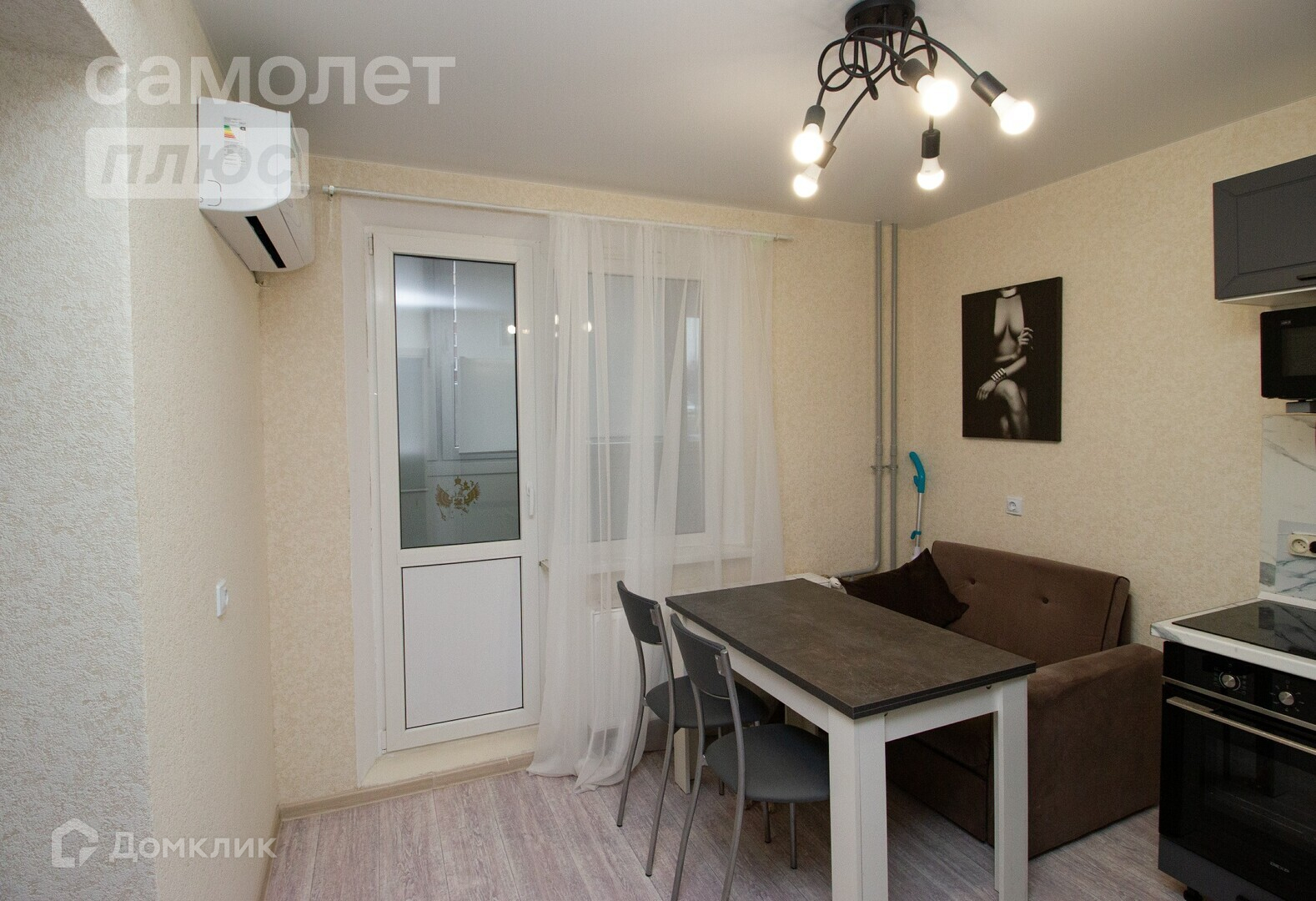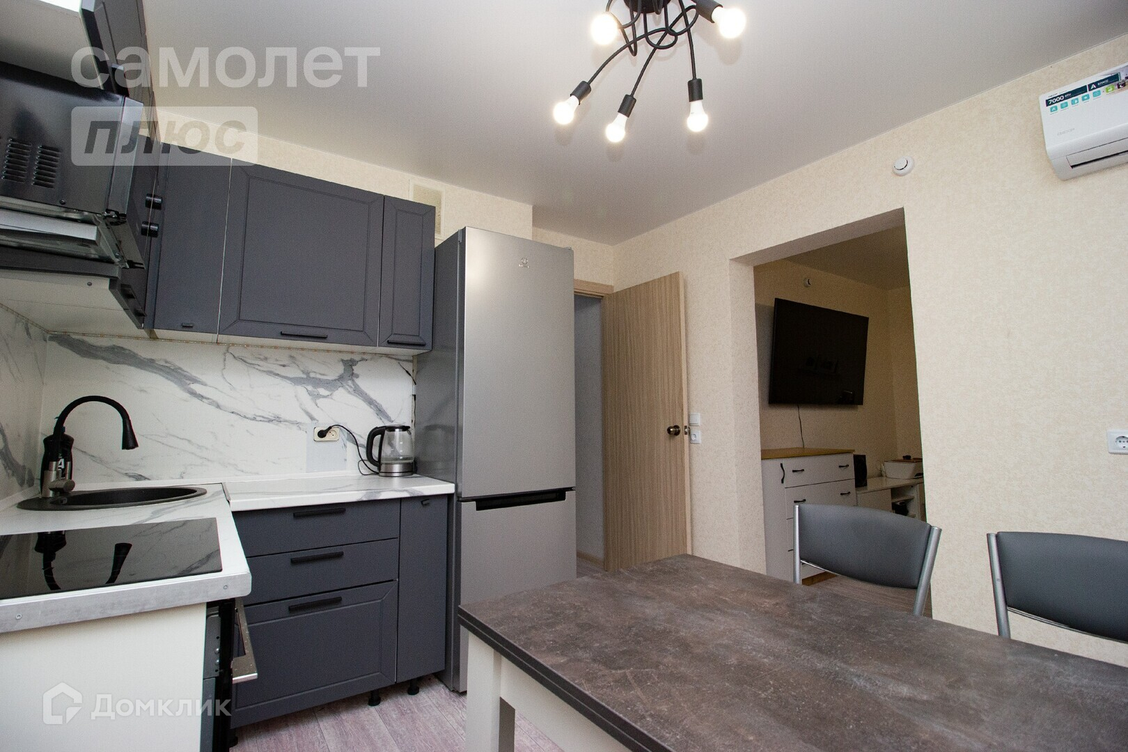 Кухня оснащена всей необходимой техникой: индукционная варочная панель; духовой шкаф; холодильник; микроволновка; обеденный стол на 3-4 персоны, кондиционер.