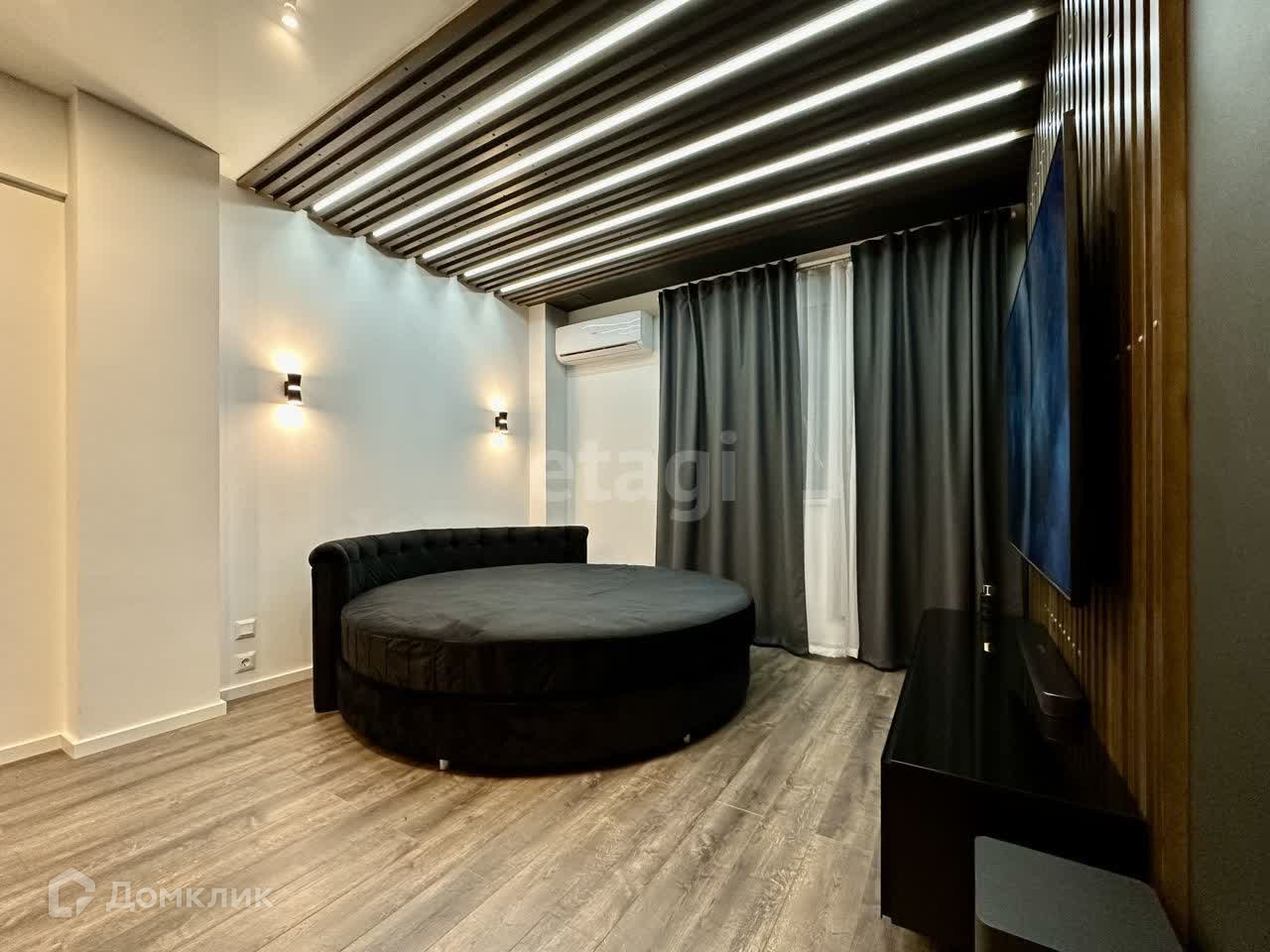 Большая круглая кровать с дорогим супер удобным матрасом, тв тумба, кронштейн для телевизора. В стене имеется кабель-канал, для скрытия проводов от телевизора. Сплит система Наiеr, светодиодная подсветка в рейках с 2-я режимами.