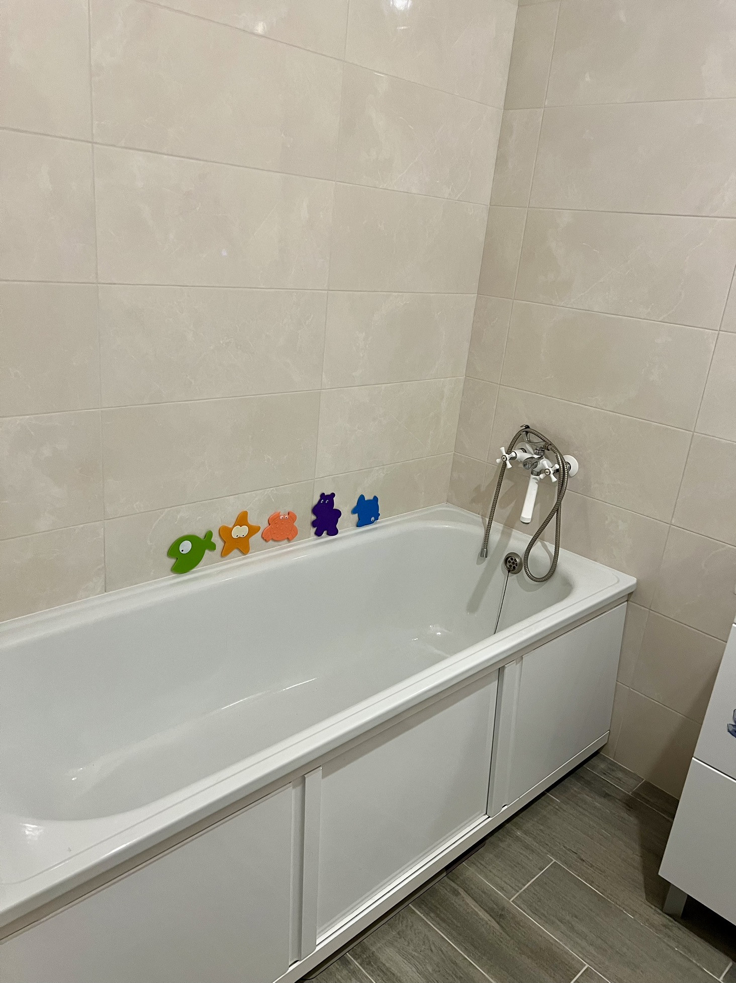 Плитка: коридор- пол, кухня - пол + фартук, ванна - пол + стены, второй санузел - пол. Одна комната - поклеены обои, постелен линолеум.