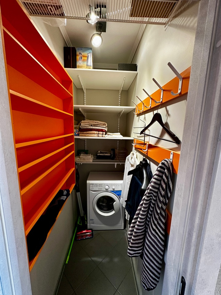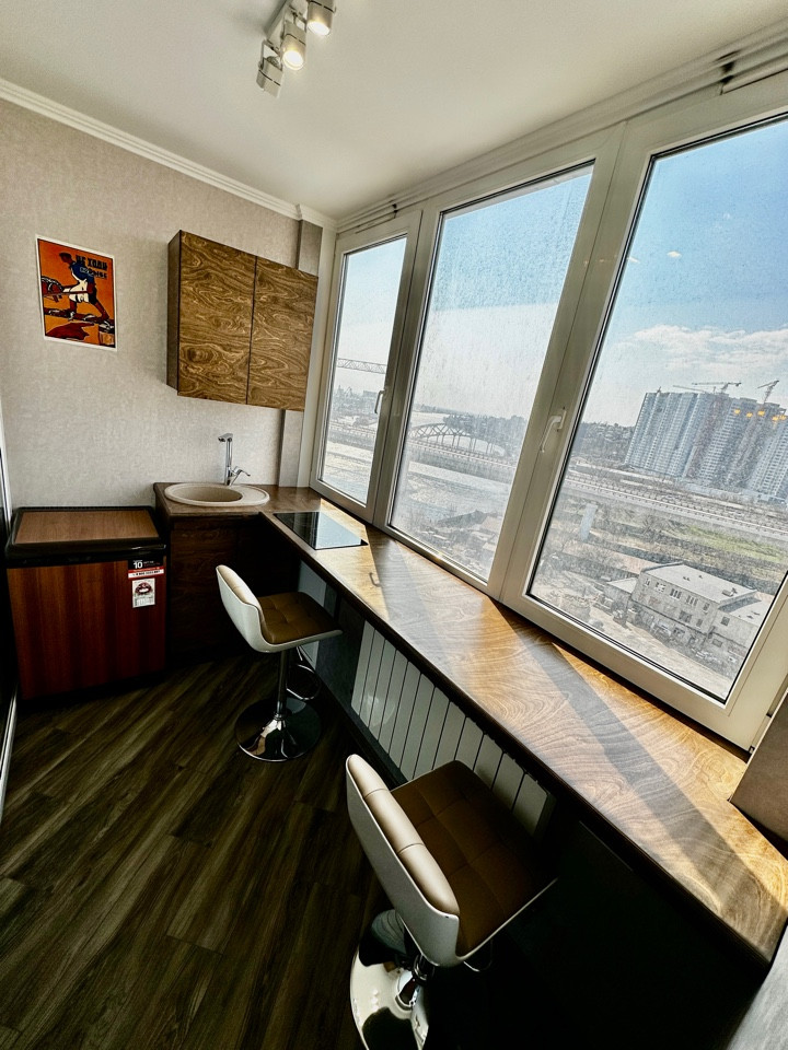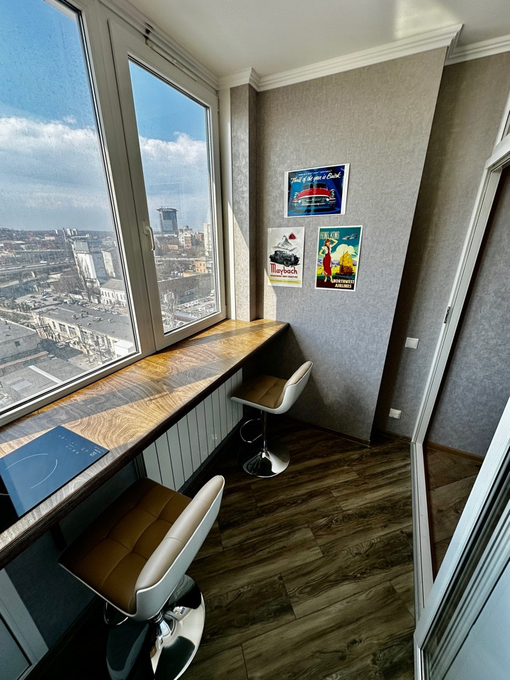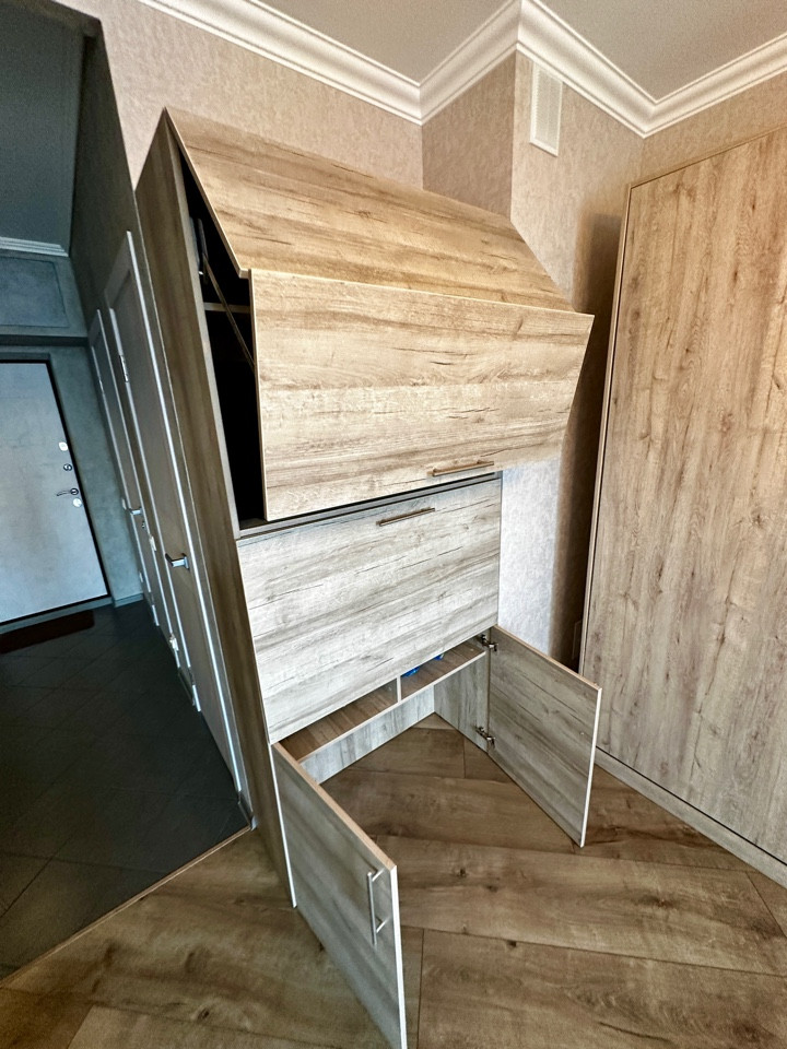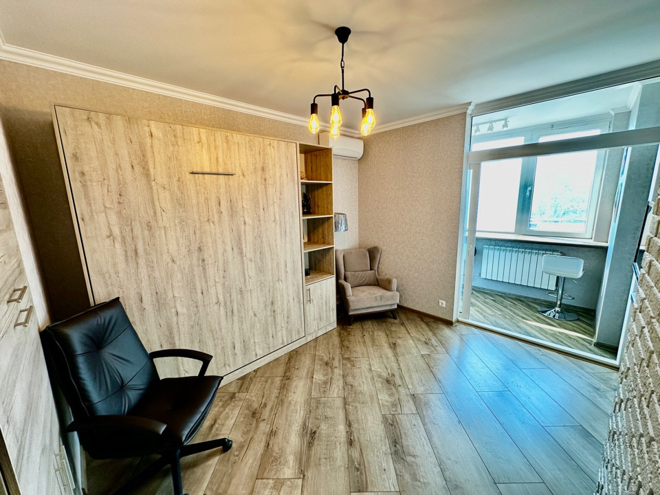 В квартире выполнен дизайнерский ремонт, полноценная встроенная откидная шкаф-кровать, просторный шкаф-трансформер с множеством отделений и ящиков, что позволяет сэкономить много пространства, тем самым делая просторной гостинную. Совмещённый санузел, полноценная гардеробная комната. На полу в прихожей, санузле, гардеробной и кухне-лоджии керамогранит с встроенными теплыми полами, в гостинной ламинат. Прекрасный вид на реку Дон открывается с окон 11 этажа.