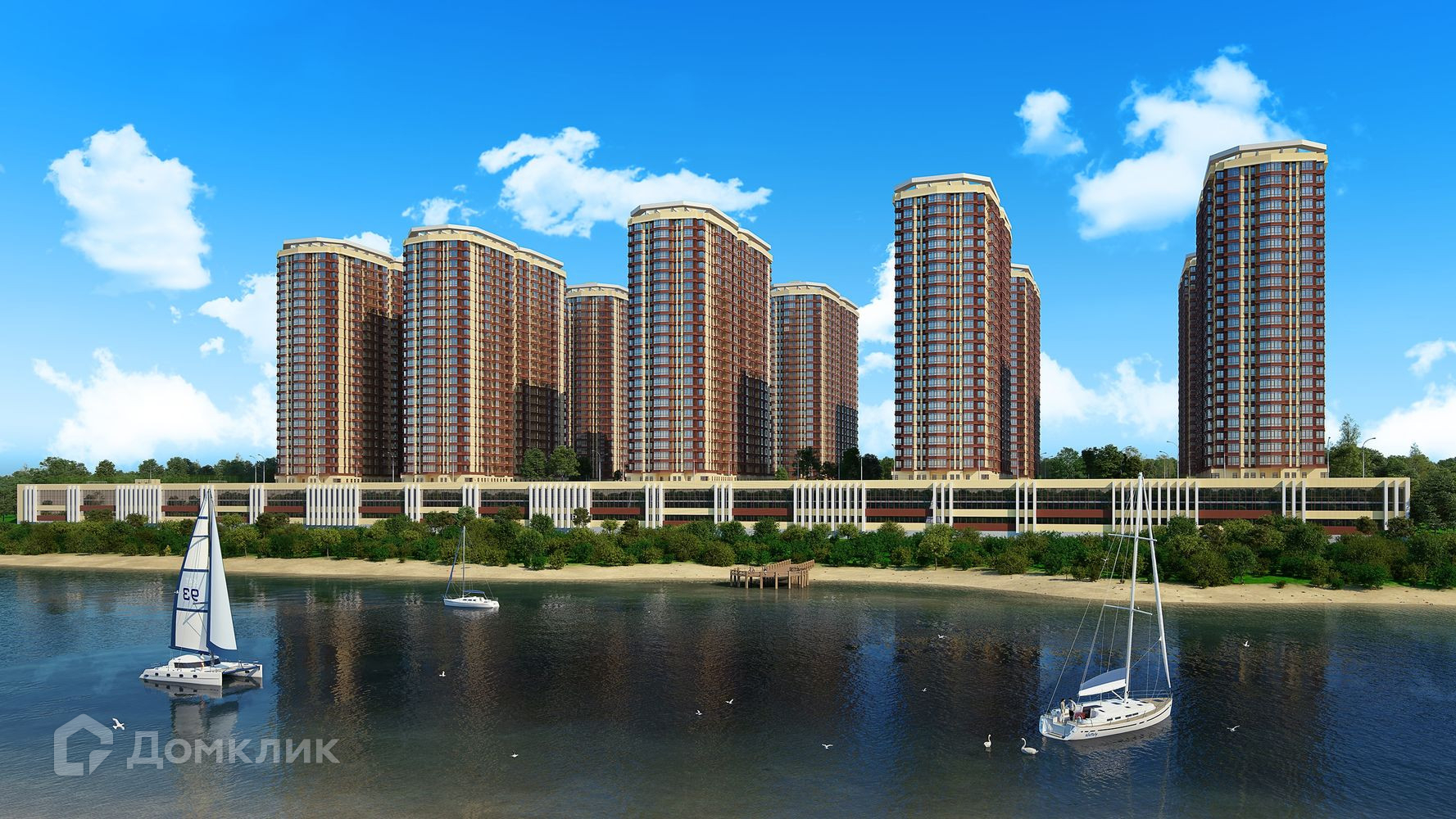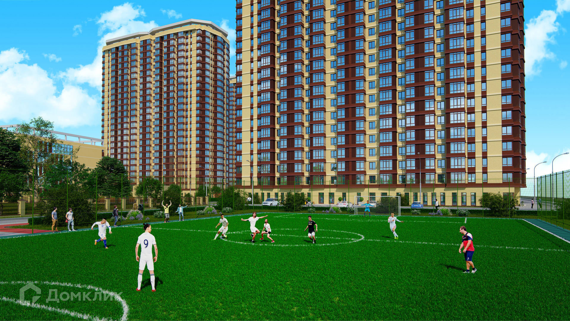 Закрытая территория, охрана, видеонаблюдение, спортивные и детские площадки, футбольное поле, собственный парк и прогулочная набережная.