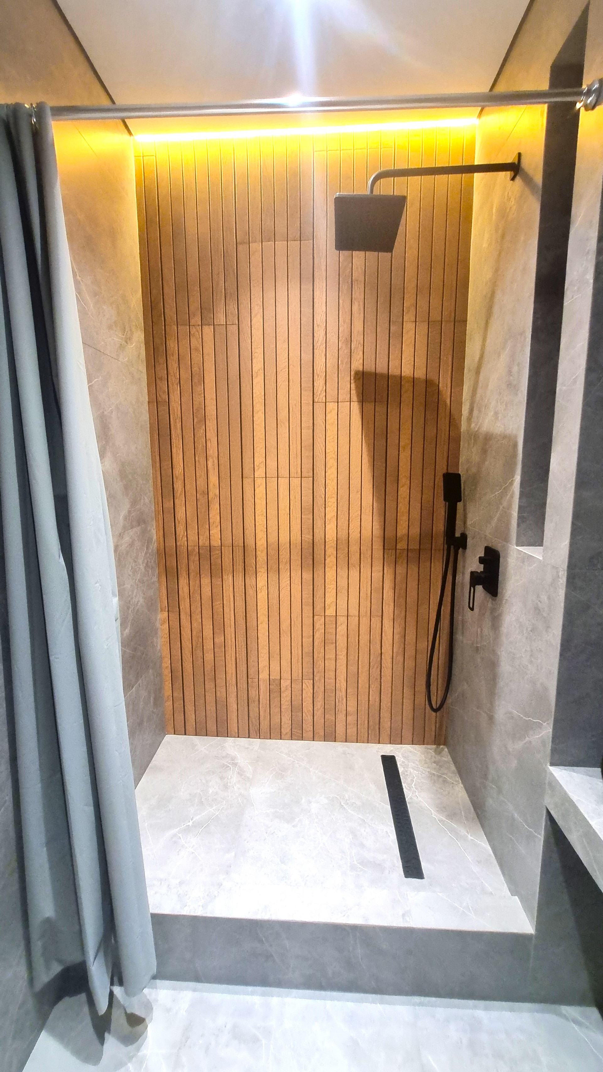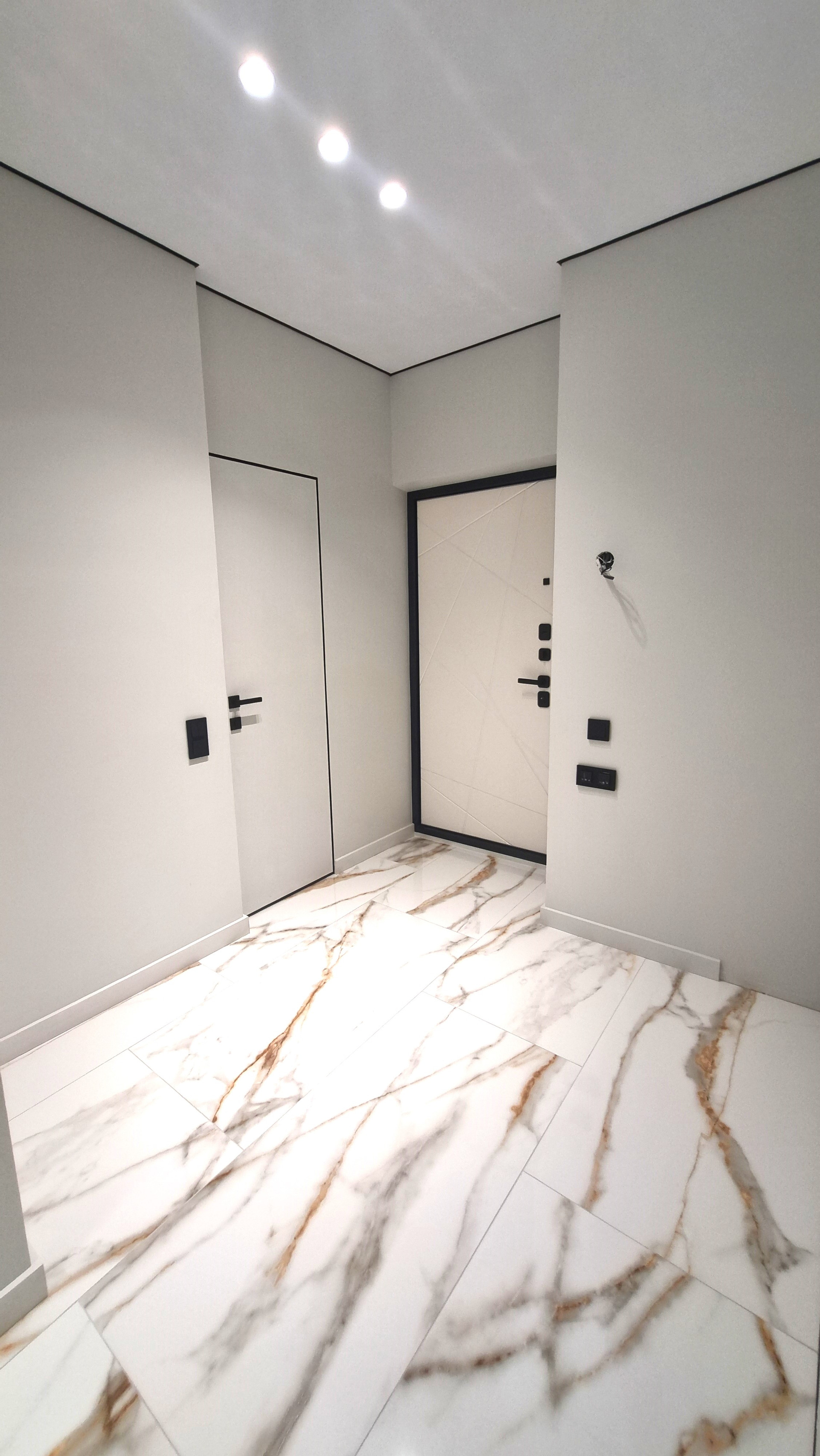 На полу в холле, ванной и кухне - широкоформатный керамогранит 600х1200 Испания.