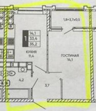 Жилая площадь 14.1 м2