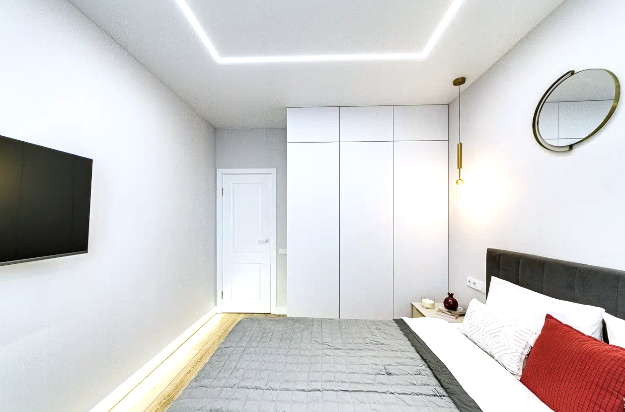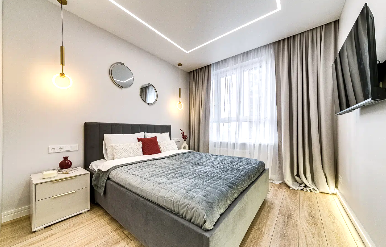 - Кухня-гостиная и мастер-спальня идут с полным наполнением, одна комната остаётся свободной, что позволяет использовать её по собственной необходимости: как детскую или кабинет. Из каждой комнаты есть выход на лоджию.