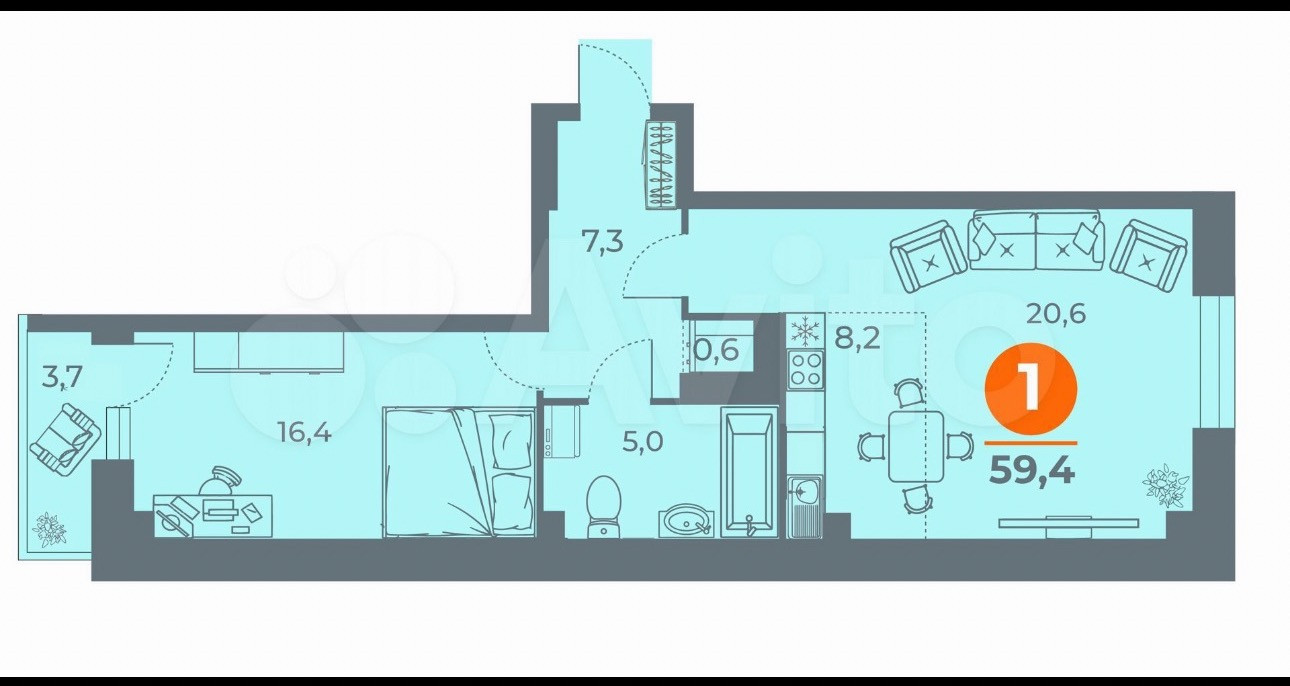 Общая площадь 59.5 м2