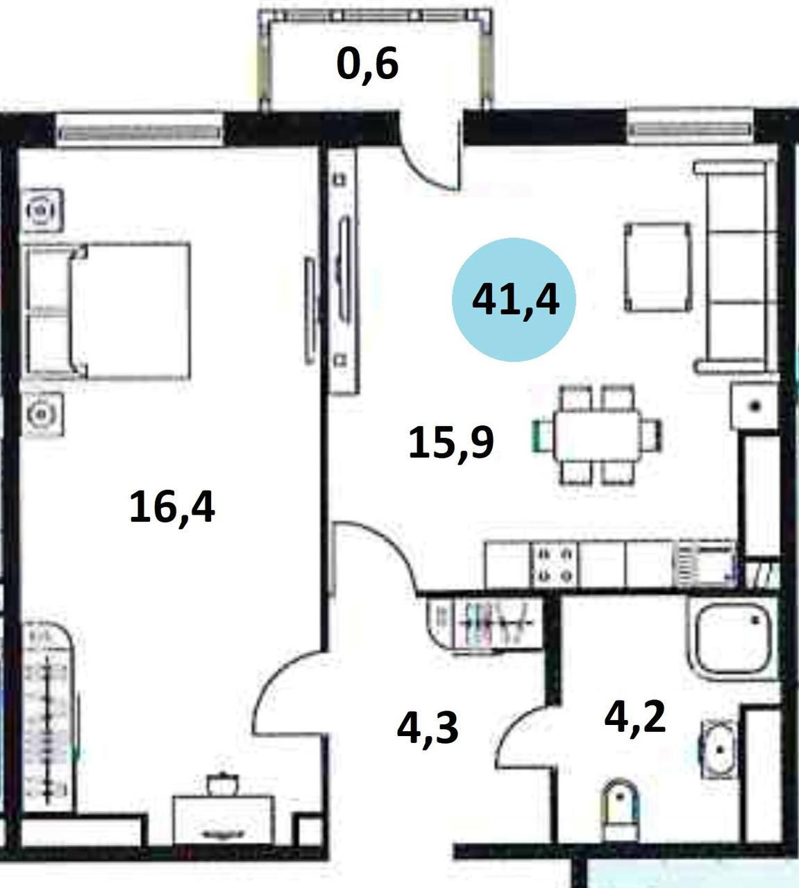 Общая площадь 41.4 м2