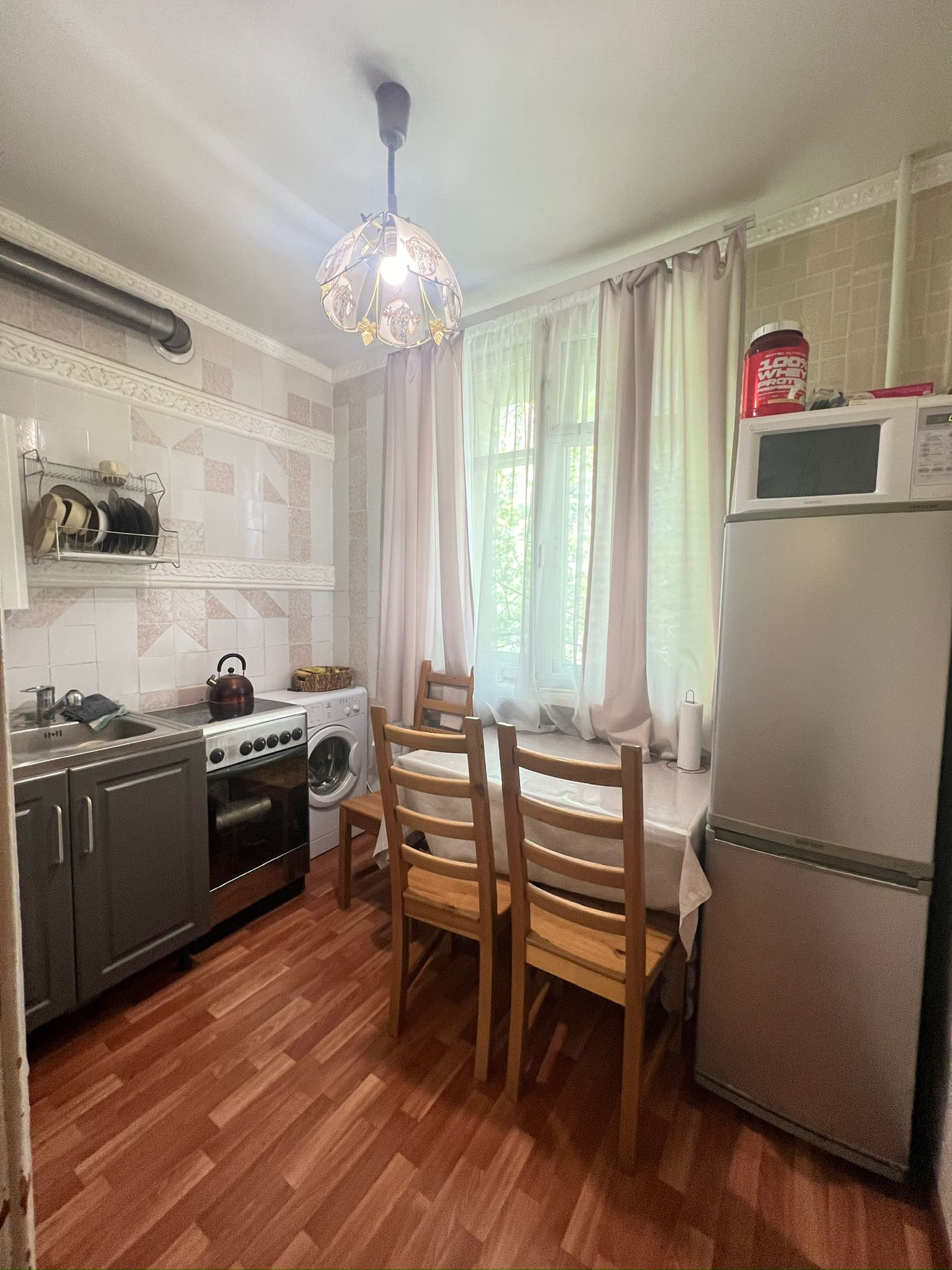 Тихий двор,весь в зелени,детская площадка и места для отдыха,парковка во дворе!