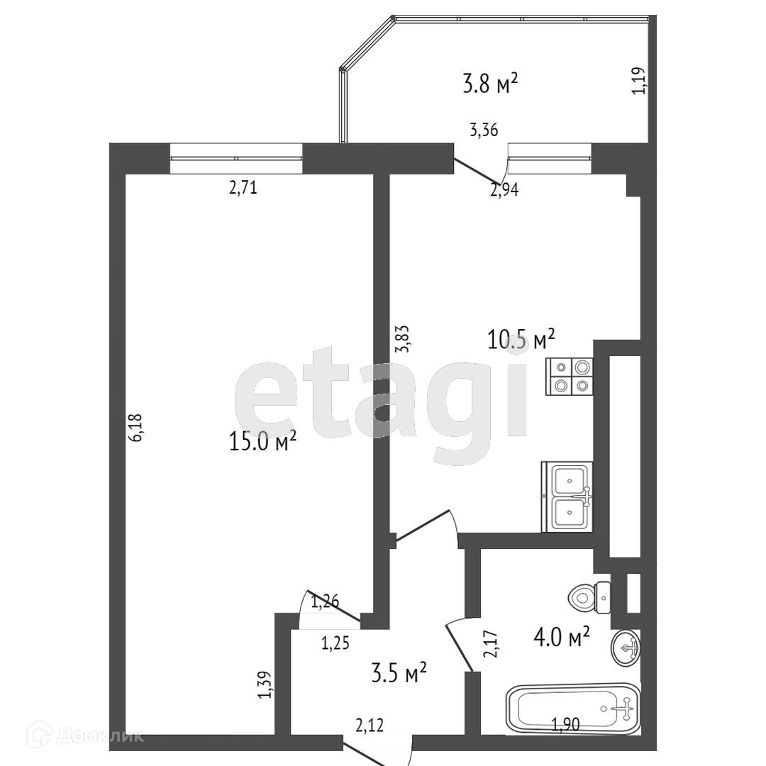В квартире соединенный с/у, кухня 14,5м2 и комната 10м2.
