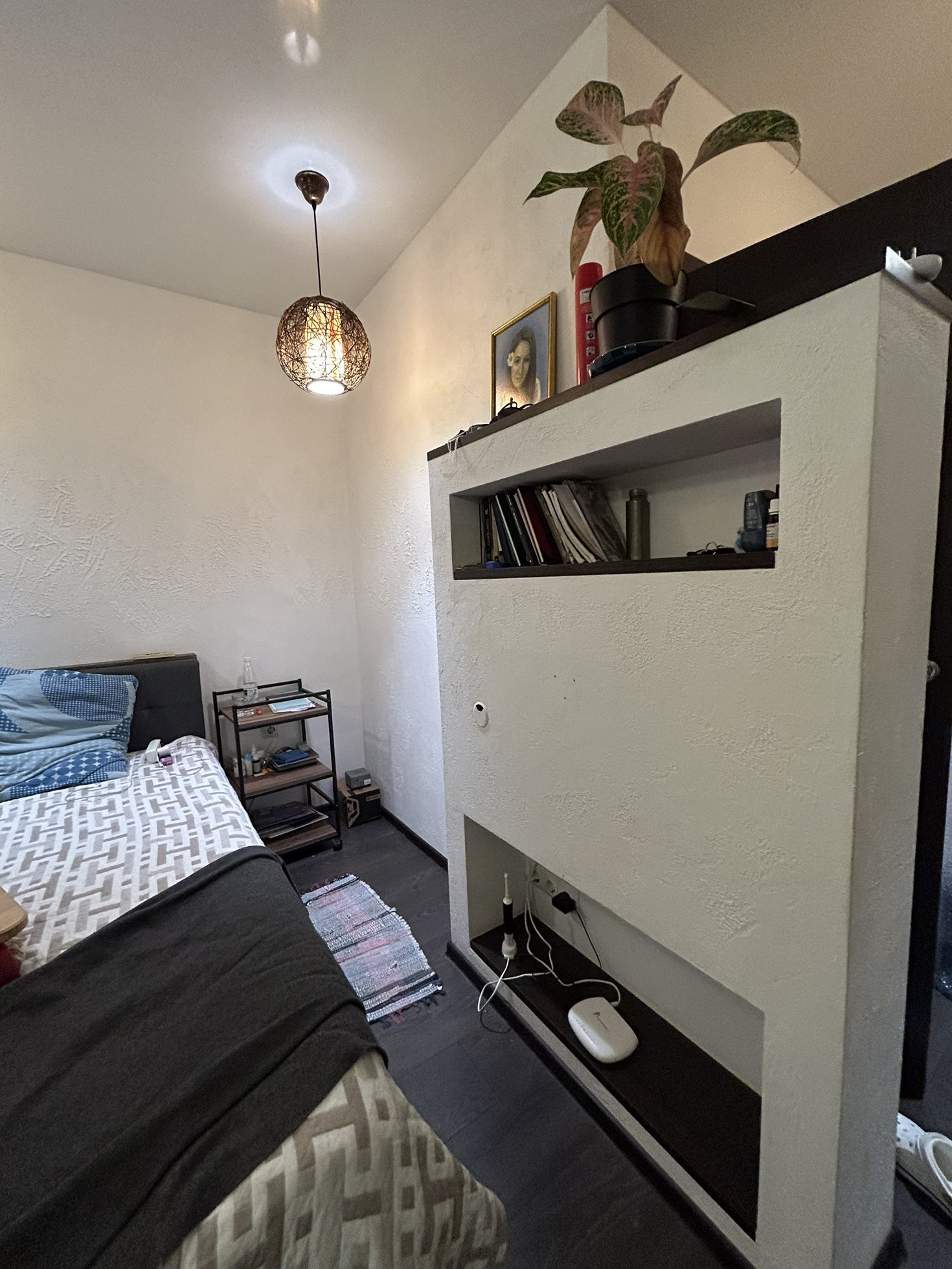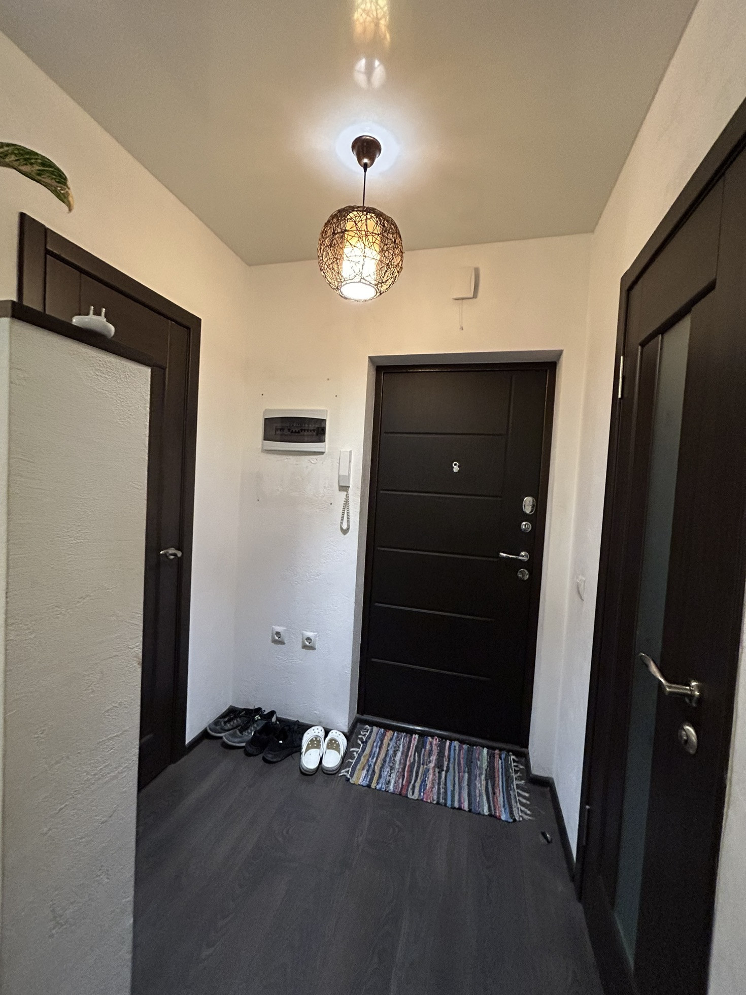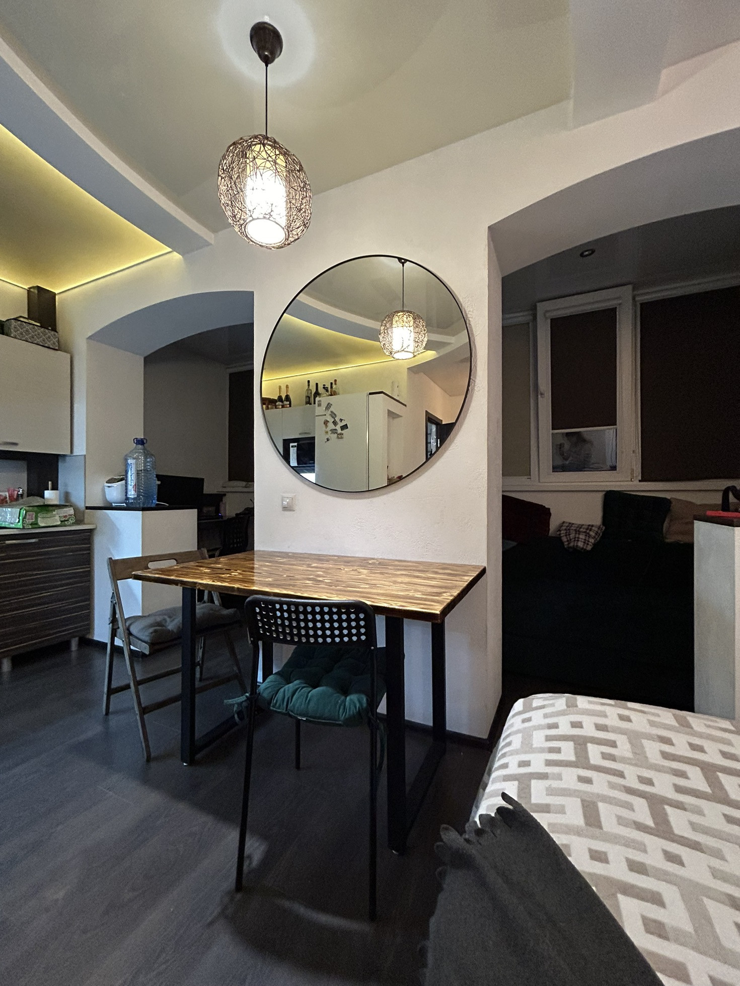 Дизайнером продумано расположение розеток. Отдельная гордеробная, так что шкаф не понадобиться. Останется кухонный гарнитур. На полу ламинат. Это 1 высокий этаж. Под квартирой жилой цоколь, по этому высота второго этажа.