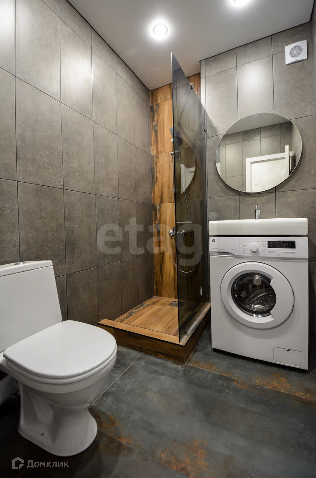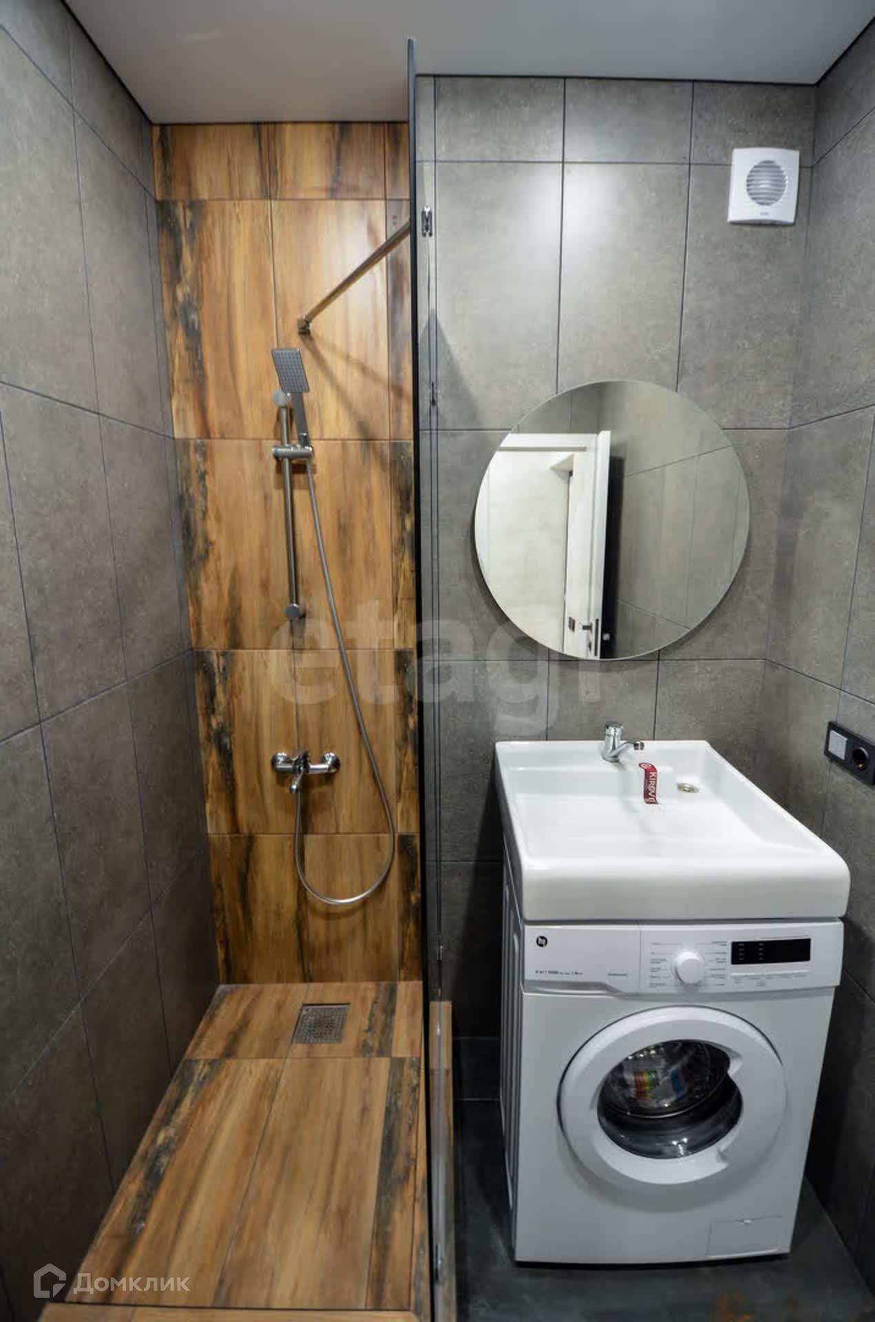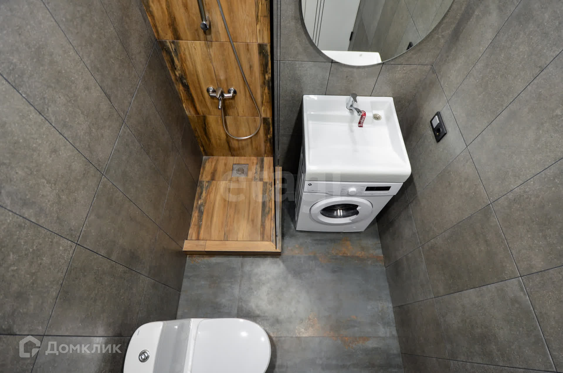 Студия оборудована совмещённым санузлом с душевой кабиной, раковиной и стиральной машиной, что обеспечивает максимальный комфорт и удобство. Грамотно спроектированная гарнитура санузла добавляет ощущение простора.