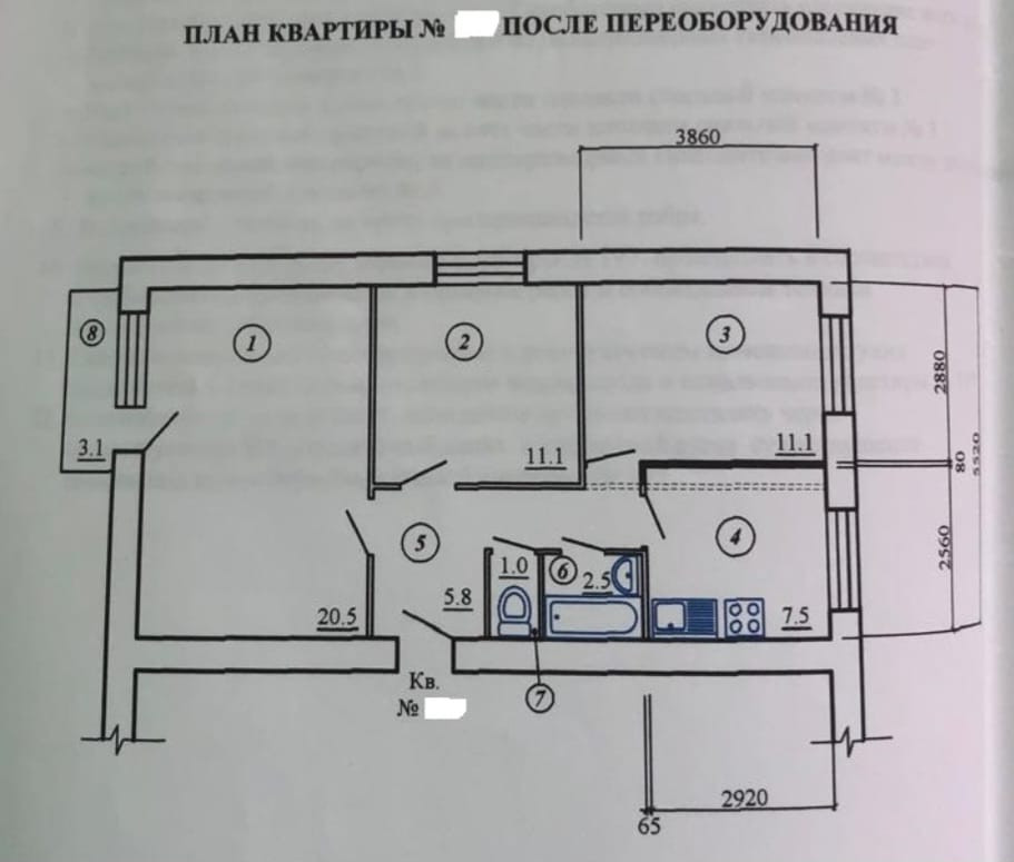 Перепланировка кухни узаконена, расширена за счет спальни, площадь кухни 7,5 кв.м.