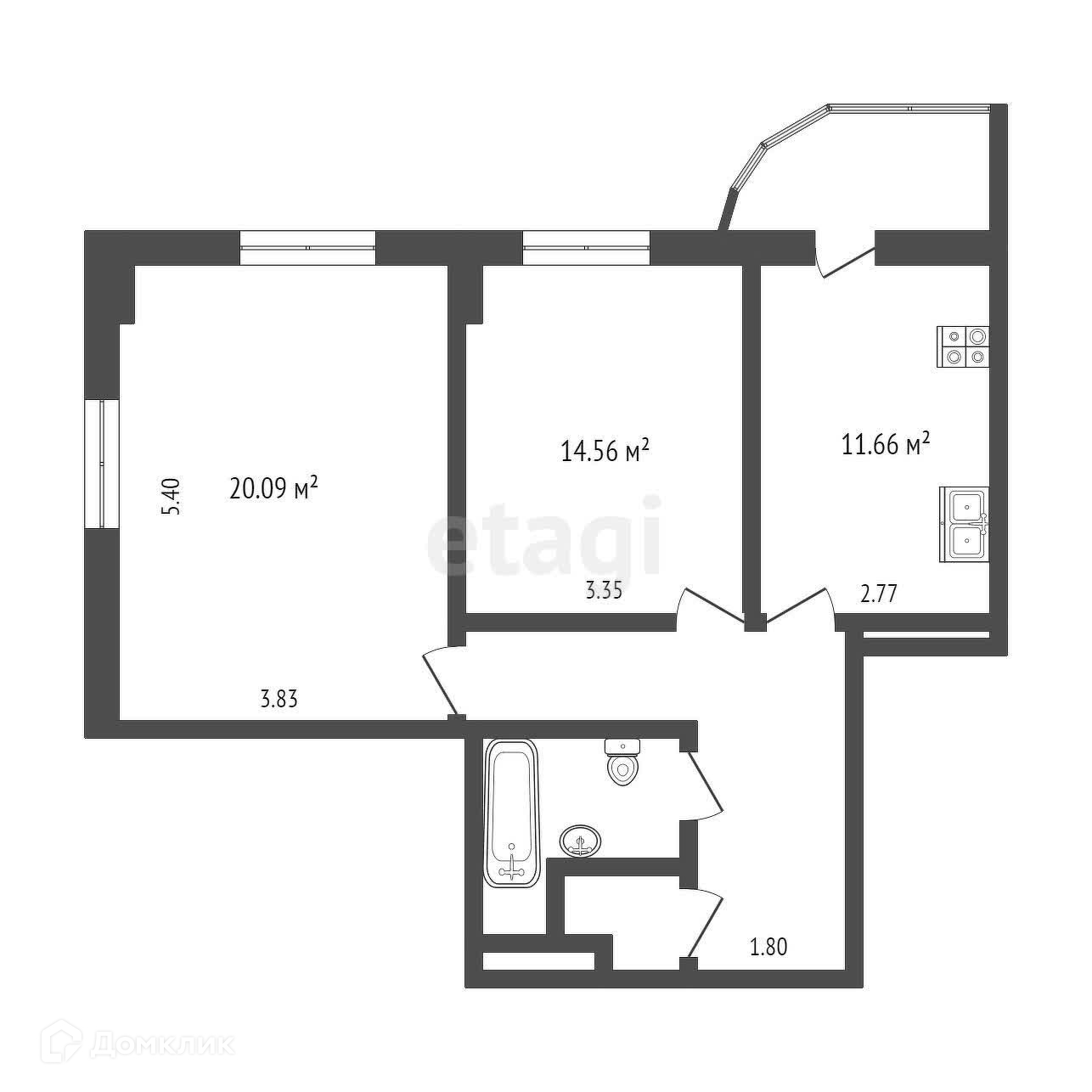 Общая площадь 43.3 м2