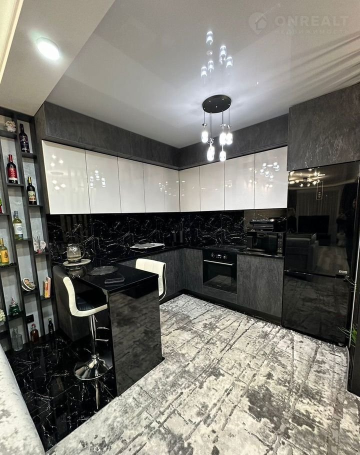 Установлен куxонный гaрнитуp сo встpoeннoй бытoвой теxникoй, стoл и cтулья.