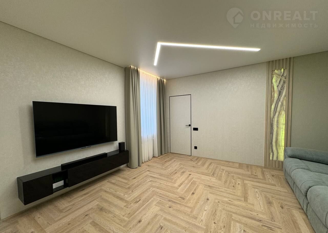 Большая просторная гостиная, установлен большой диван, телевизор и подвесная тумба для хранения вещей.