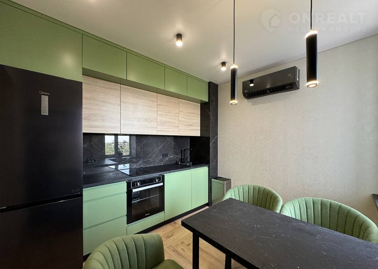 Зона кухни с шикарным видом полностью оборудована, кухонный гарнитур в три яруса с большим количеством мест хранения. Установлен холодильник, стиральная машина.