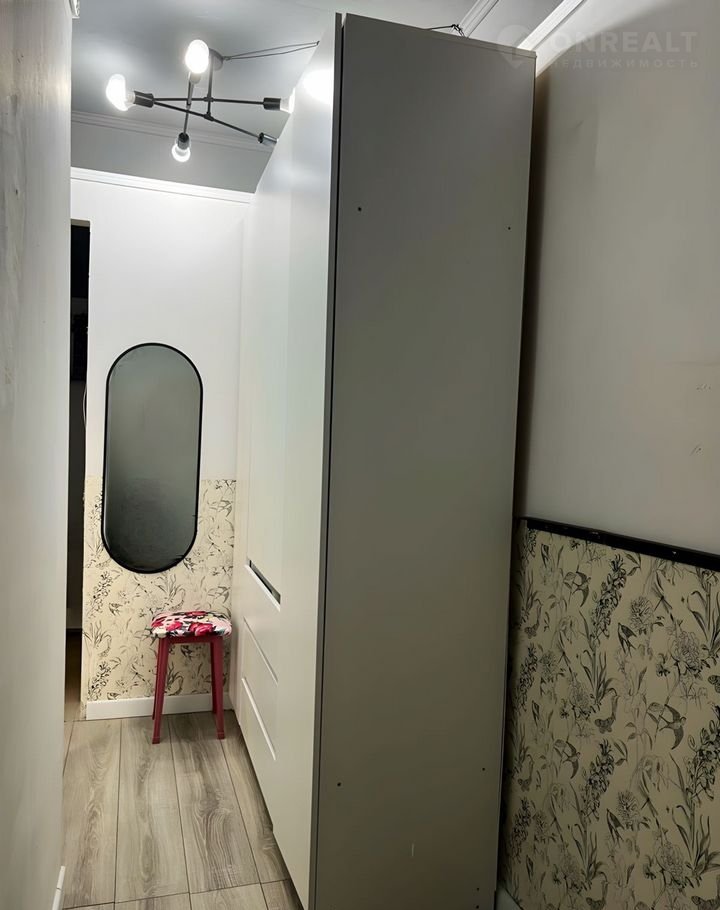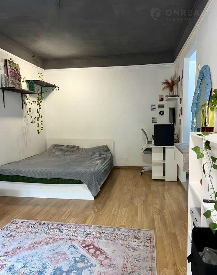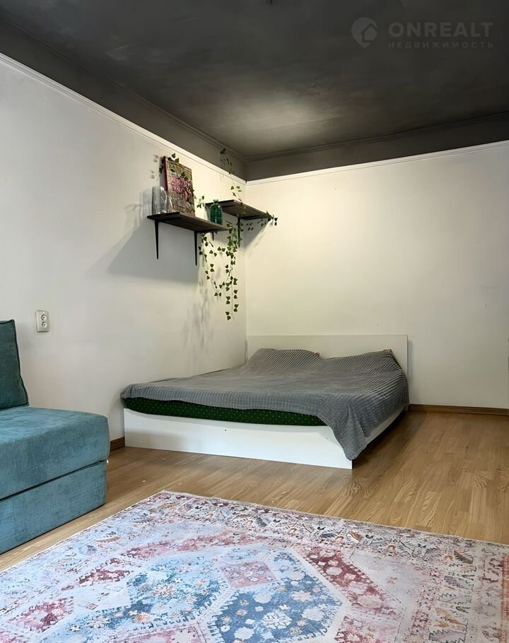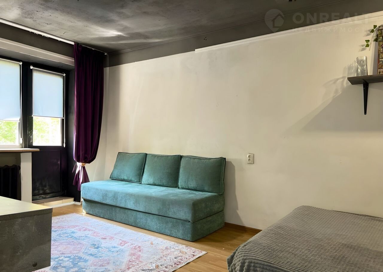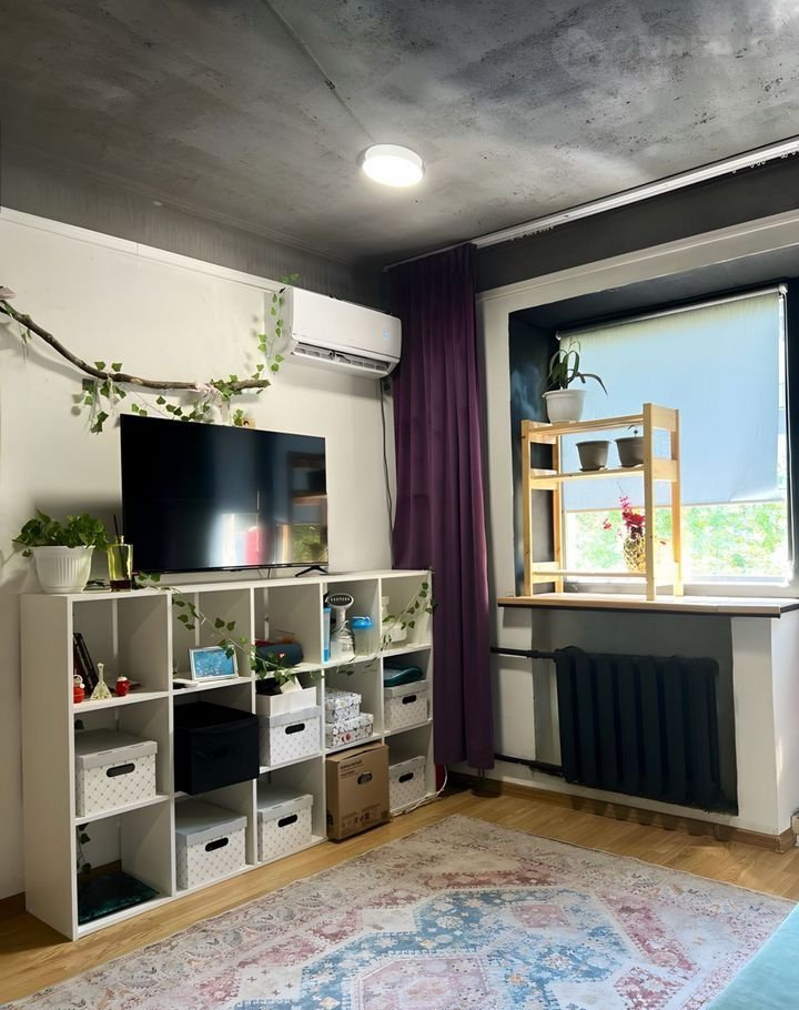 В квартире выполнен качественный ремонт в современном стиле. Комната зонирована на гостиную и спальню с большой кроватью. Мебель и техника остаются частично.