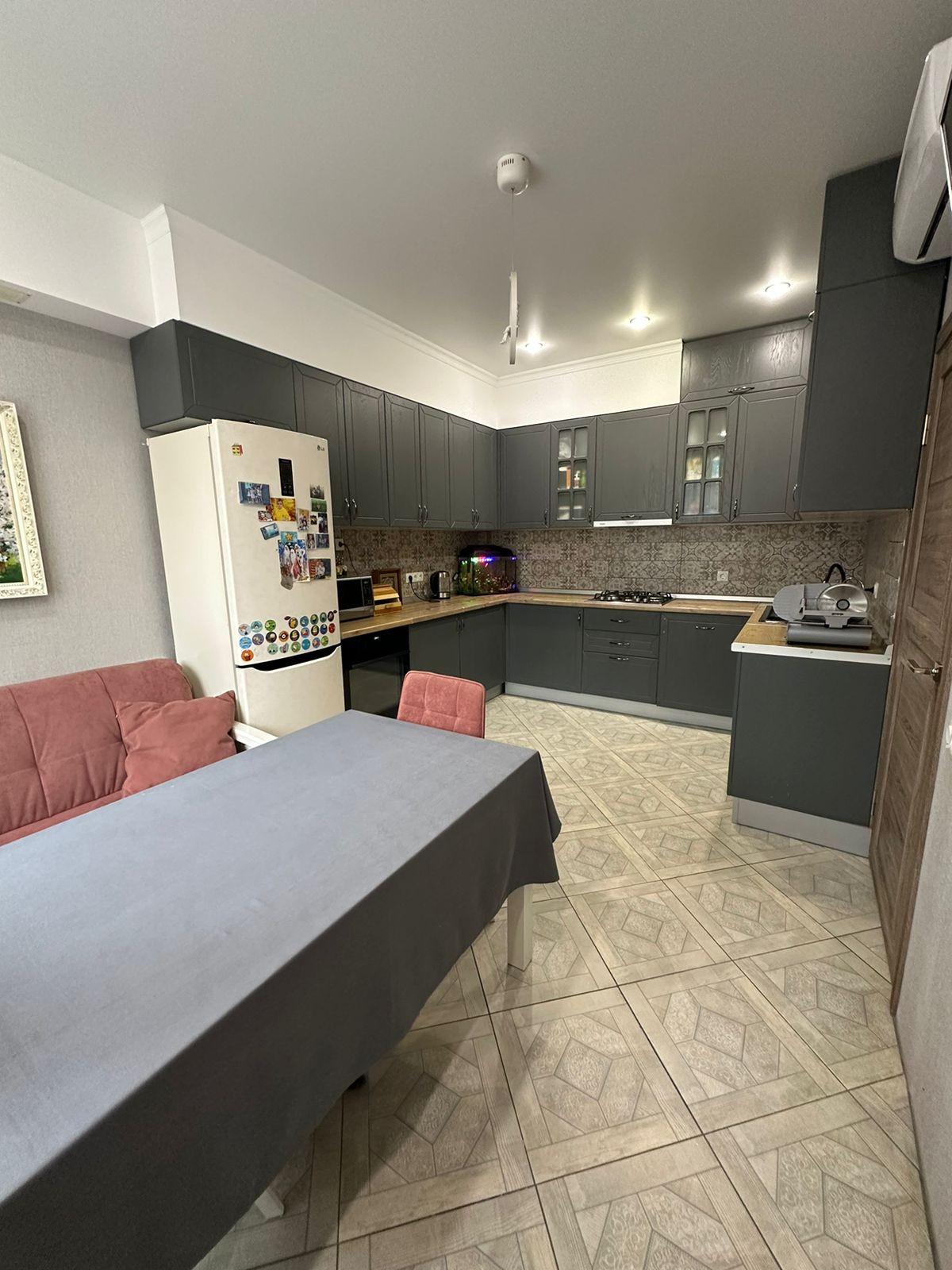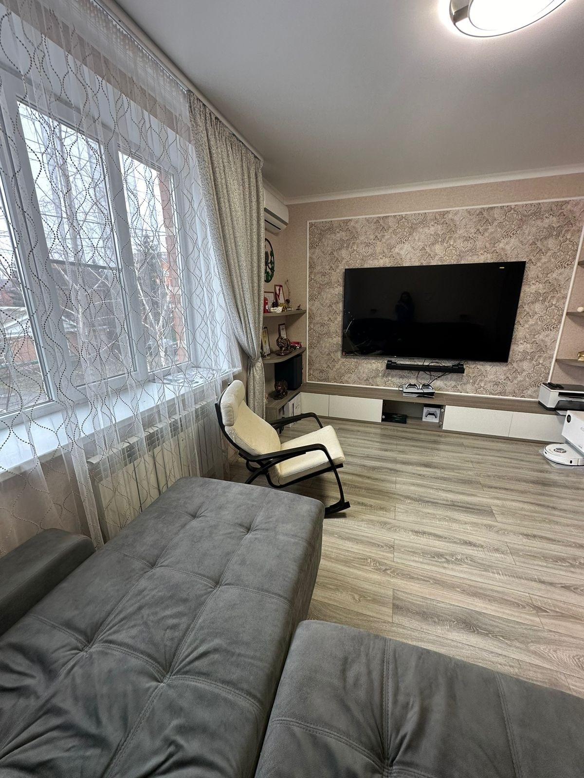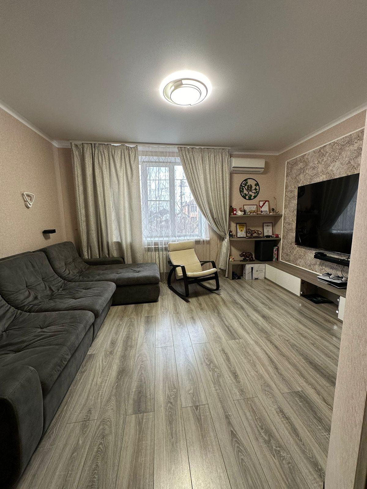 Площадь общая 91,9 м2, кухня - 15,9 м2, двухконтурный газовый котел, два санузла, теплые полы, хороший ремонт делали для себя. Все остается по договоренности.