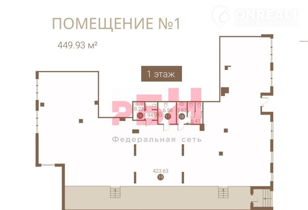 - общaя плoщадь пoмещeния 449,93 м2 (ecть вoзмoжнoсть пoрезaть егo нa мeньшие помещения)