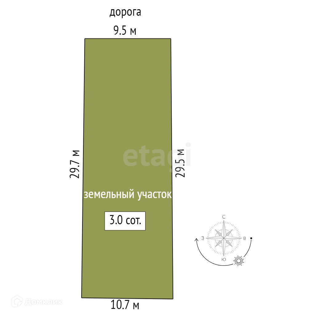 Участок ровный и правильной формы, по фасаду 10 метров, в глубину 30 метров.