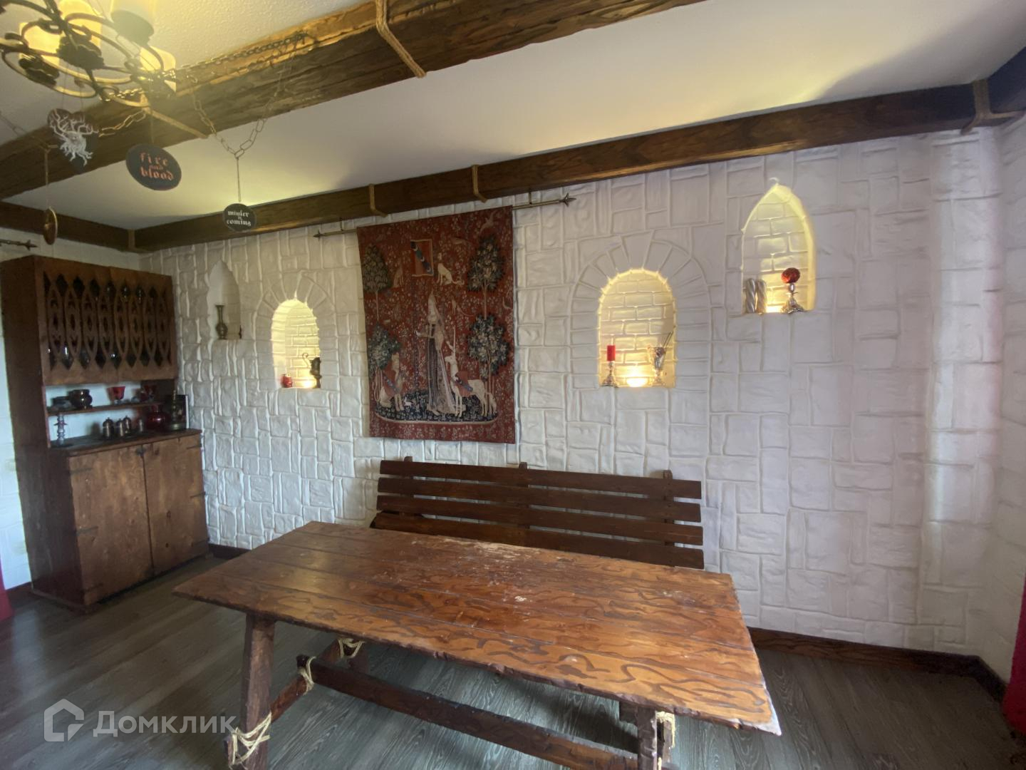 Первый этаж: просторный холл, две изолированные комнаты- кабинет и спальня и просторная зона каминной с действующим камином, красиво оформлена балками. Совмещенный с/у с ванной. Кухня-столовая 17 метров- полностью оснащена всей бытовой техникой, вплоть до блендеров, тостерниц и СВЧ печей, сама кухня угловая с красивыми деревянными фасадами+ встраиваемая бытовая кухонная техника.