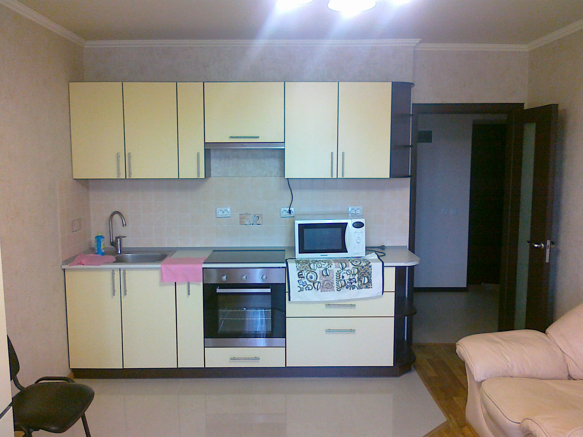 - Кухня-столовая 18,1 м2 (современный холодильный Haier, встроенная варочная панель и духовой шкаф, кухонная стенка с мойкой, мягкий диван, компьютерный стол со шкафом, деревянный обеденный стол и два деревянных стула, тюль, микроволновка, сплит-система);