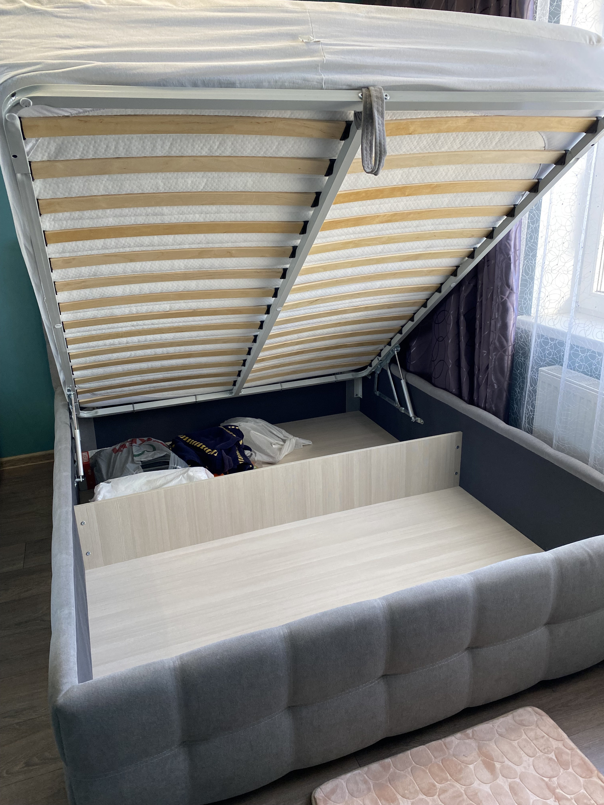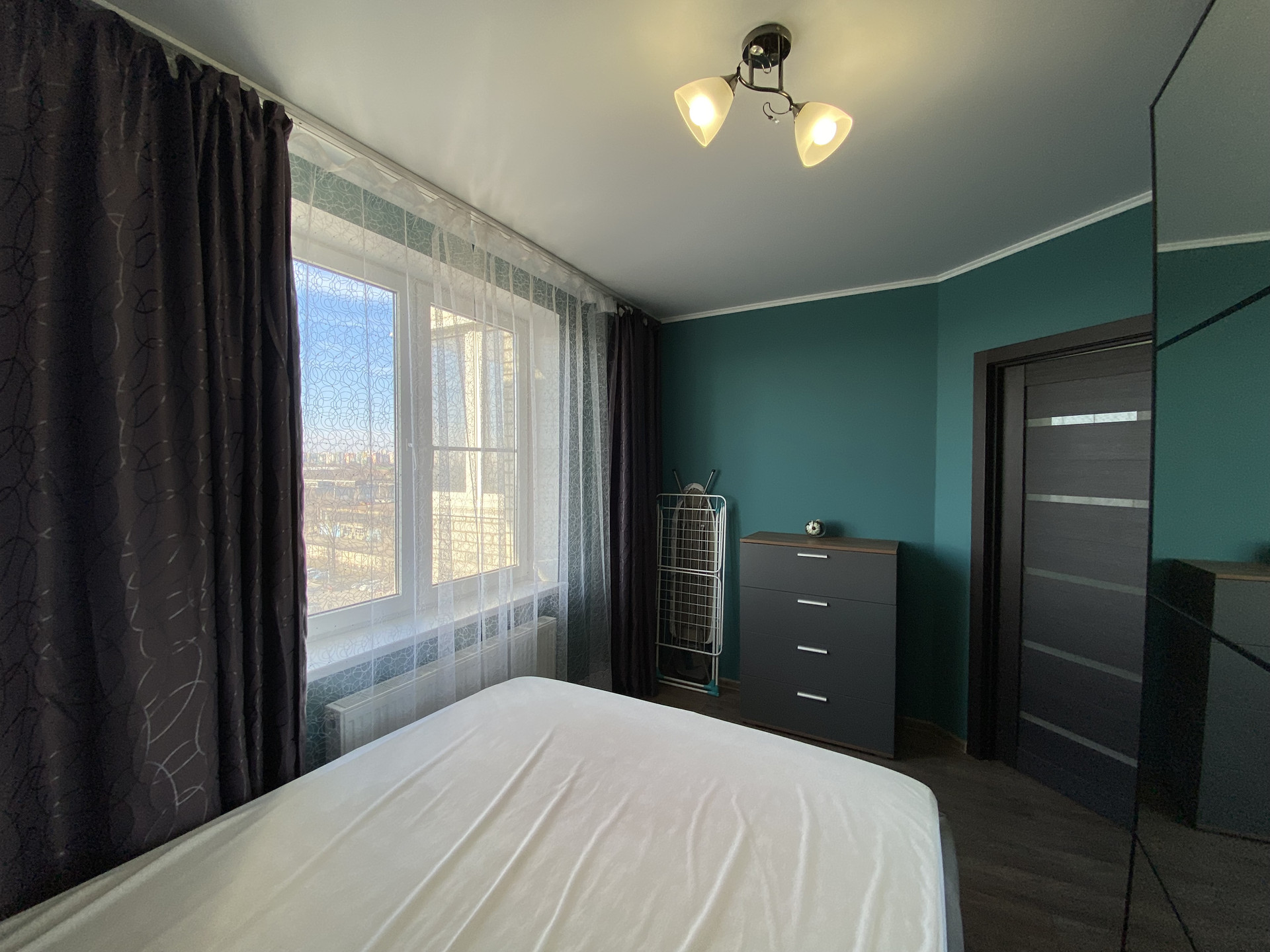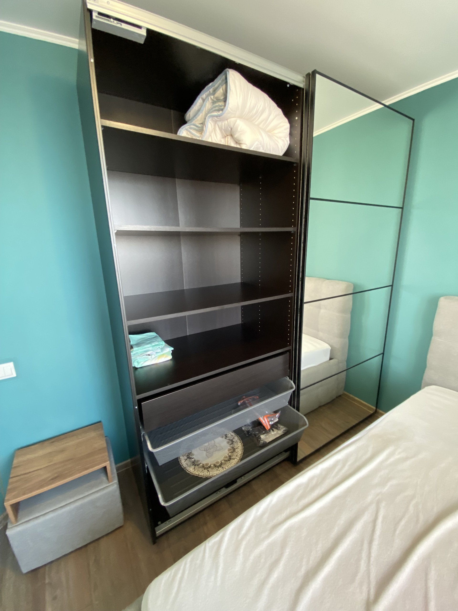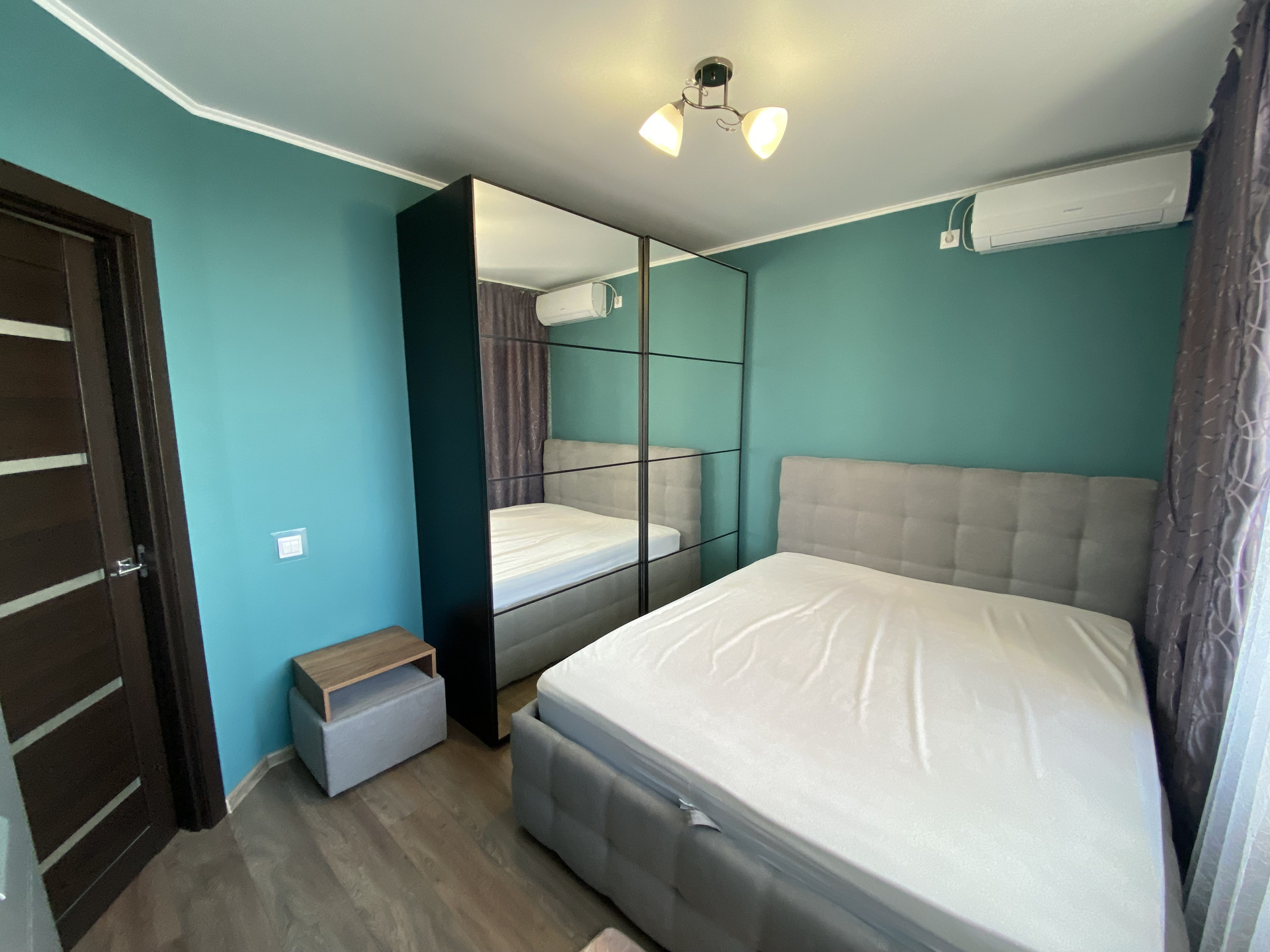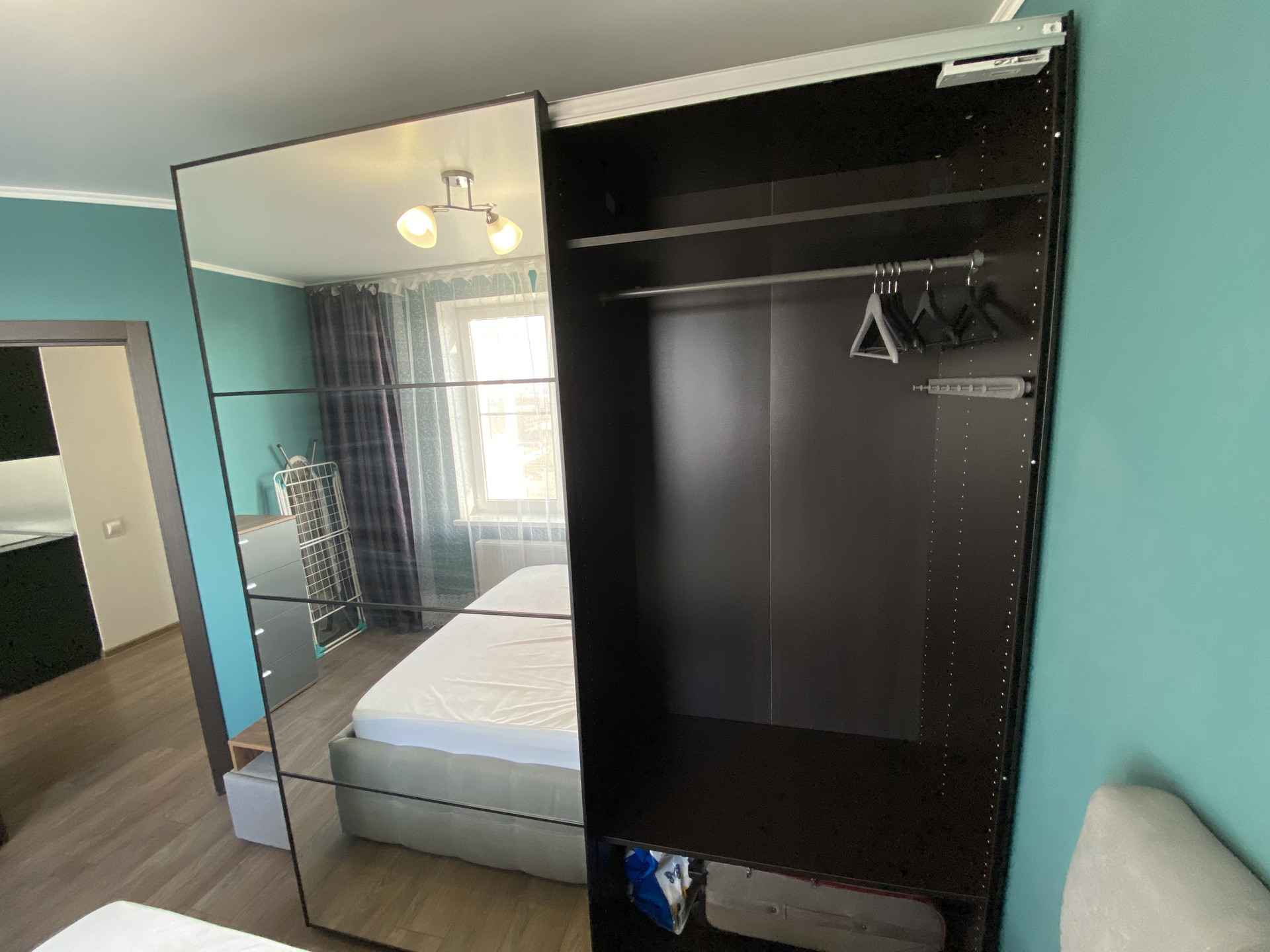 Планировка –«евродвушка». Спальня с кроватью 2х спальной 160*200 с подъемным механизмом, хорошим высоким матрасом, шкаф-купе Икеа.