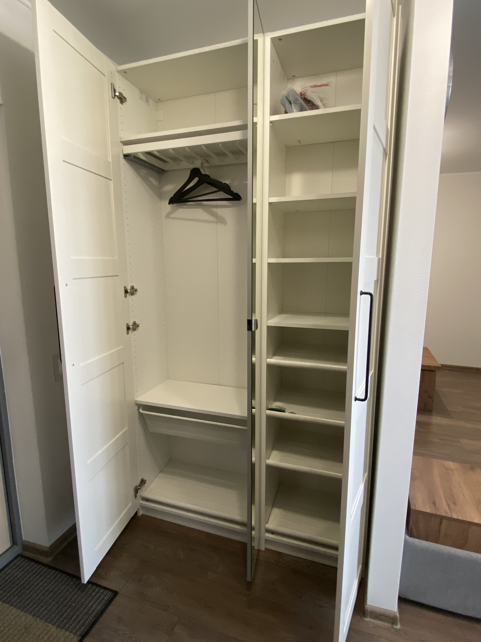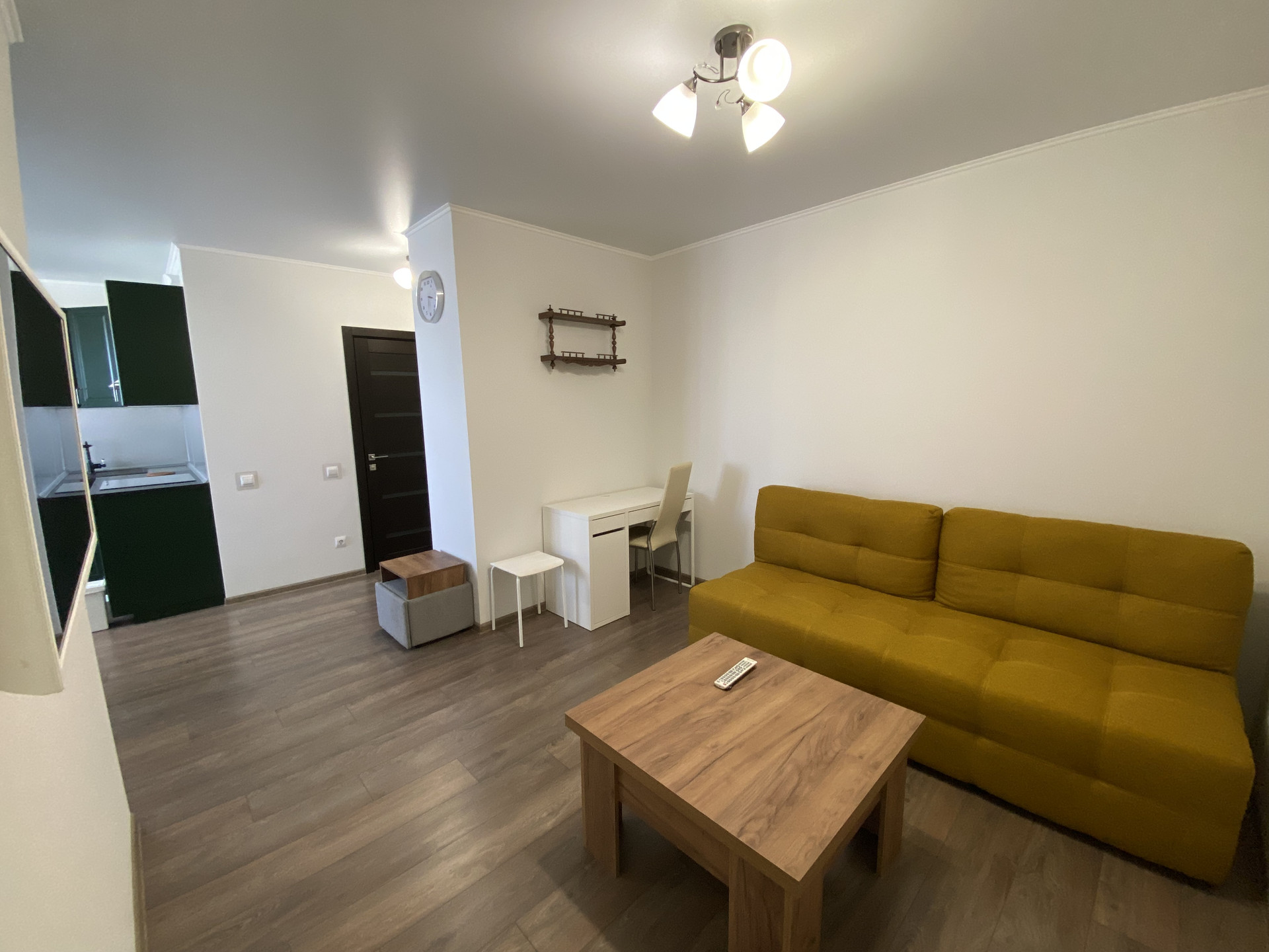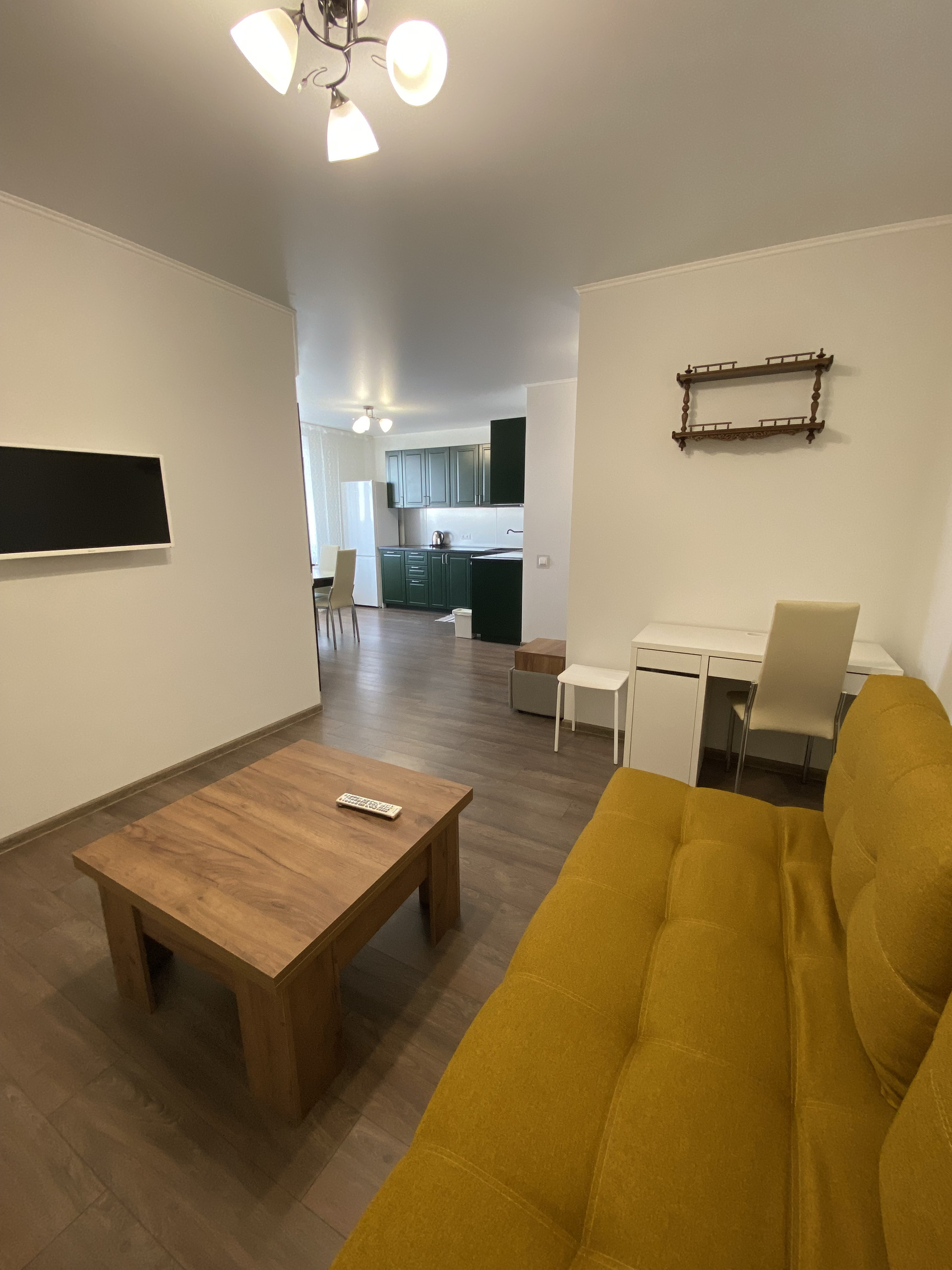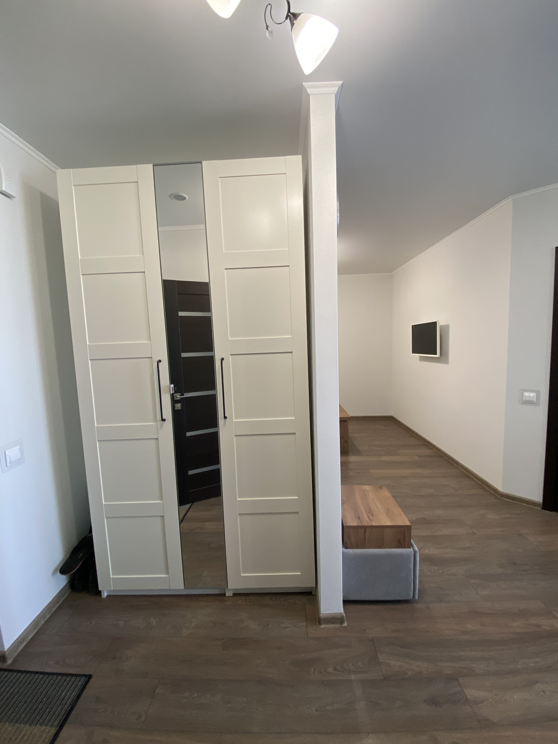 Диван, телевизор, холодильник, стиральная машинка, посудомойка, сплит, письменный стол, раскладной стол, в коридоре шкаф также Икеа.