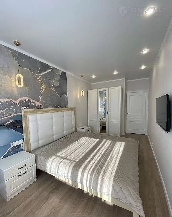 Квартира с мебелью и техникой. Есть кухонный гарнитур, шкаф, стиральная машинка, кондиционер, телевизор, раскладной диван, двуспальная кровать.